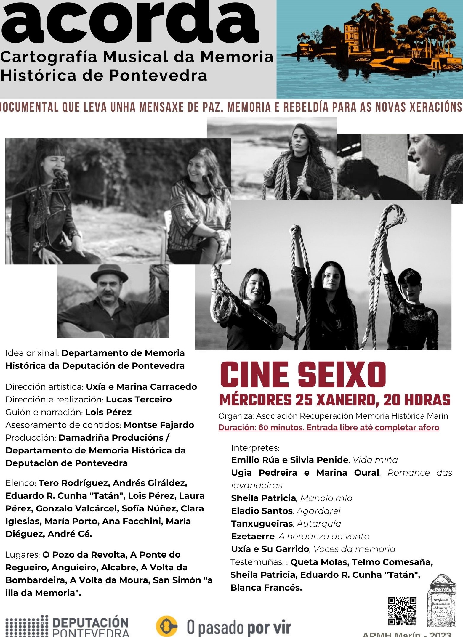 O próximo mércores, 25 de xaneiro ás 20 horas proxectarase na sala de cine de Seixo o documental “ACORDA, Cartografía Musical da Memoria Histórica de Pontevedra, nun acto organizado po la Asociación pola recuperación da Memoria Histórica de Marín