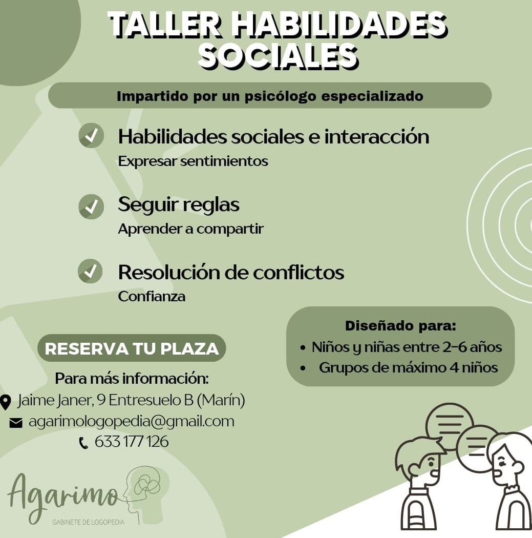 El gabinete marinense de logopedia “Agarimo” ubicado en la calle Jaime Janer 9, entresuelo, pone en marcha un taller de habilidades sociales para niños y niñas de entre 2-6 años impartido por un psicólogo especializado con el fin de ayudar a los más pequeños a mejorar su capacidad para interactuar y conectarse con otros niños.