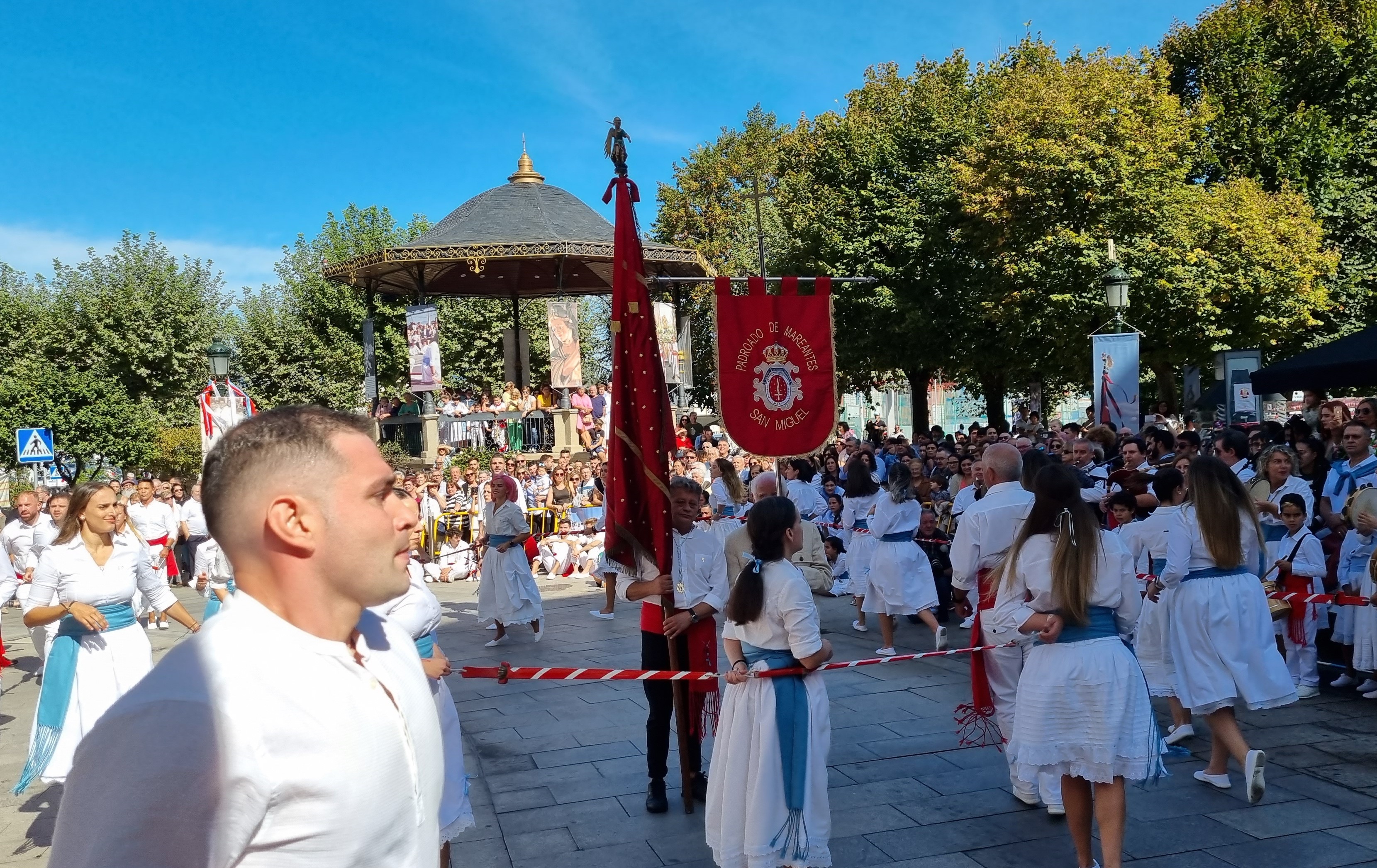 Y es que la Danza de Espadas de Marín tiene un origen y una motivación que no es otra que la de honrar a San Miguel, Patrón de los Mareantes, marineros que rendían su homenaje al Arcángel especialmente en la festividad de septiembre o, me imagino que cuando tuvieran ocasión para ello. Y en las evoluciones de la Danza de Espadas de Marín no se puede, mejor dicho, no se debe, obviar esa motivación porque tanto cuando la bailaban solamente los mareantes, como ahora que lo hace la juventud masculina y femenina que la conserva, la Danza de Espadas de Marin realiza su baile ante la imagen de San Miguel bajo cuya anda pasan las filas de danzantes varias veces durante la interpretación y, en un momento de la misma, realizan la figura de la estrella rodeando el Pendón que tiene siglos de antigüedad, tras realizar el rodeo que en el vídeo se ve una y otra vez en forma de caracol incompleto. Entiendo que, aunque fuera como valor testimonial, se pudo utilizar el mencionado Pendón que, además, tiene una imagen en miniatura de San Miguel en su cúspide, lo que sería un indicativo suficiente del “corazón” de la Danza.