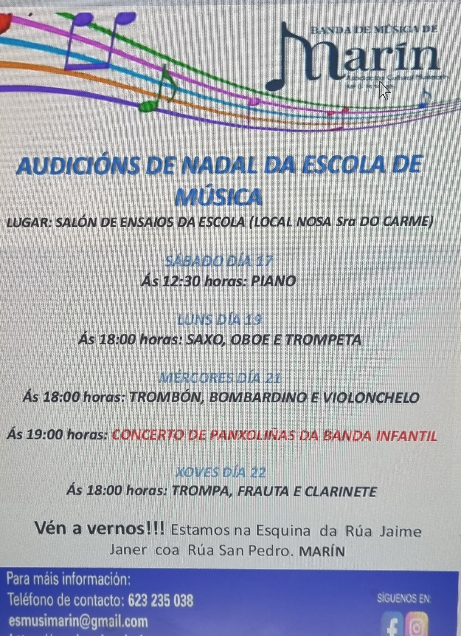“Audiciones de Nadal da Escola de Música” se denomina la actividad que Musimarín organiza para los próximos días y empezando en la jornada de mañana, a las doce y media, con la sección de piano. El próximo lunes serán los alumnos de saxo, oboe y trompeta los que ofrecerán su concierto a partir de las seis y media de la tarde; El miércoles, día 21, a las 18 horas, los de trombón, Bombardino y violonchelo y, a las siete, la banda infantil ofrecerá un concierto de villancicos.