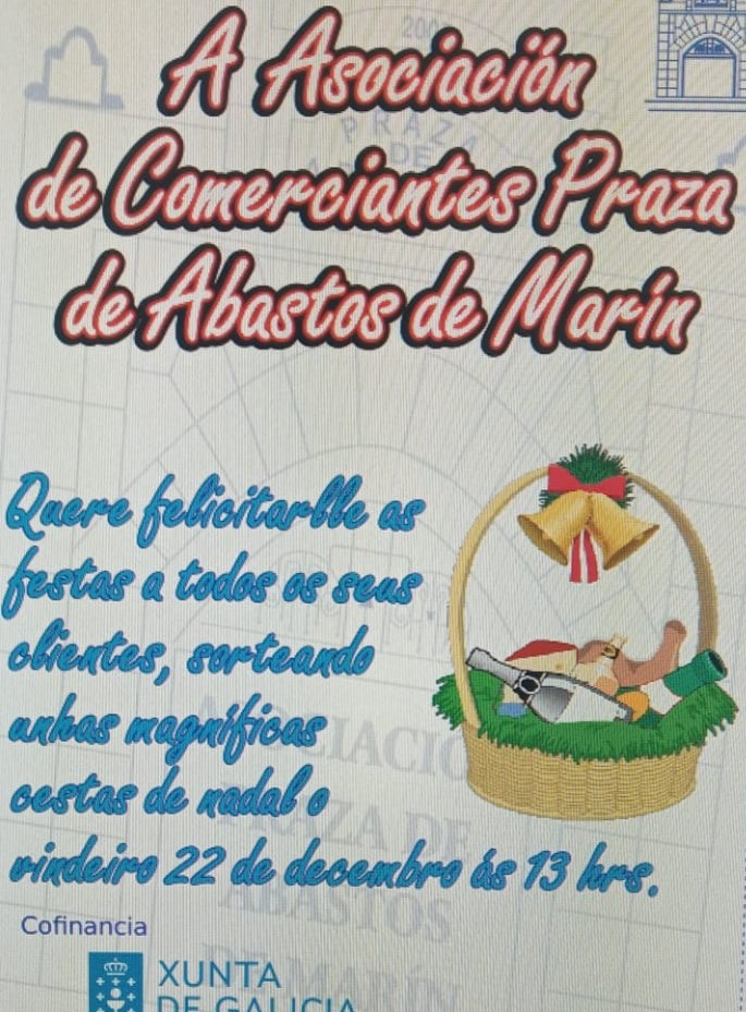 Al efecto en una nota de prensa recuerdan: “Desde a Asociación de Comerciantes da Praza de Abastos de Marín, queremos comunicarvos que temos en marcha a campaña de nadal, a través da cal se repartirán preto de 10.000 rifas entre aqueles clientes que realicen algunha compra en calquera dos postos asociados, durante estas datas tan significativas. Unha vez cumplimentadas, deberán depositalas na urna que se habilitará para tal fin e o xoves 22 de decembro ás 13 horas celebraremos o sorteo de 8 Cestas de Nadal, entregándose as mesmas o venres día 23 ás 13 horas”.