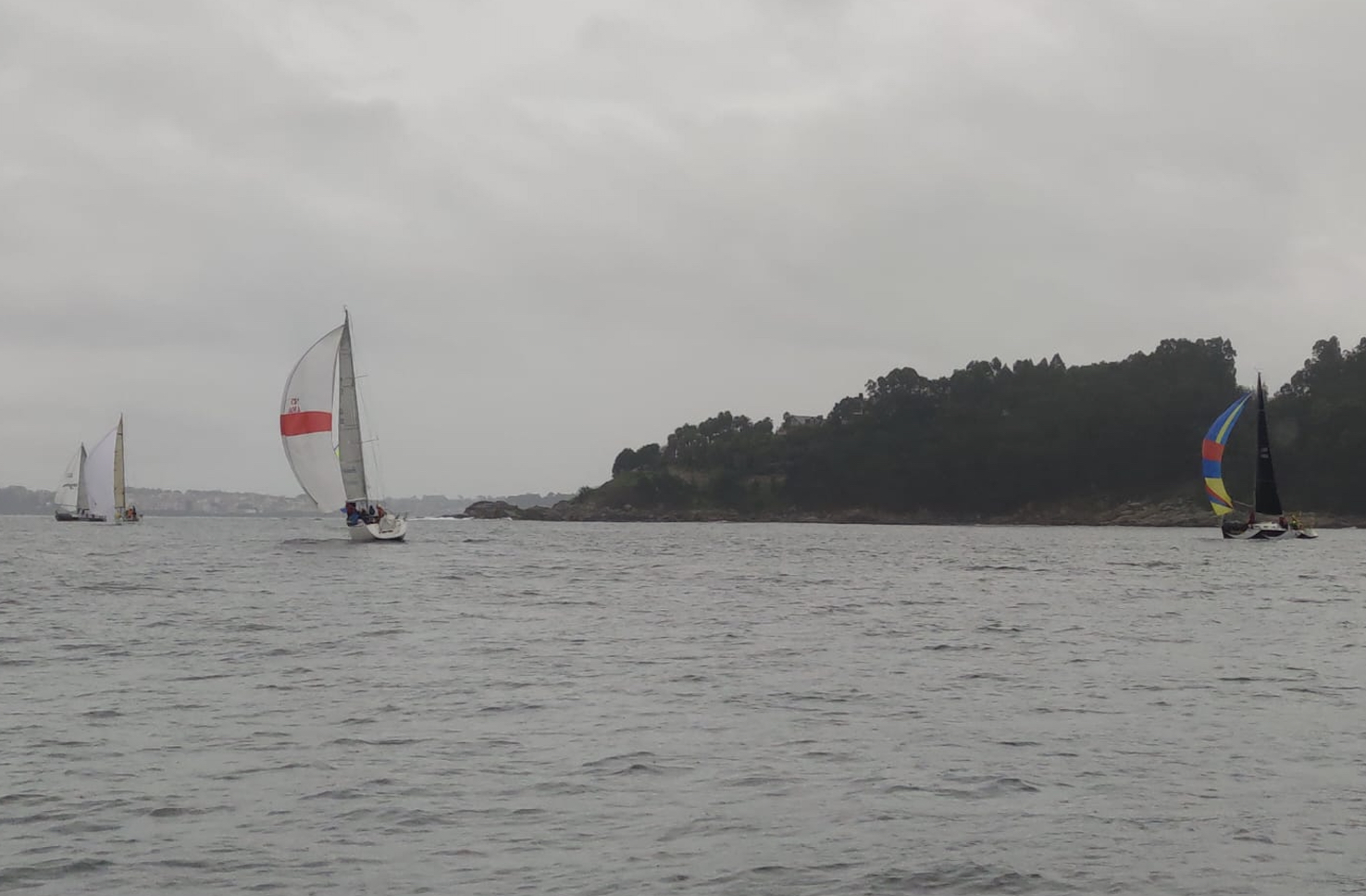 Tras una salida puntual a las 14:35 horas frente al club de Aguete donde partió muy bien el “Travesío”, el tramo de desmarque fue bastante bien gracias a los 7 nudos de viento iniciales, pero en la popa hacia Morrazán, el viento ya bajó un poco aunque los barcos mantuvieron la velocidad gracias a los casi 3 nudos de corriente a favor que tuvieron (ocurre a veces cuando hay lluvias algo constantes y la bajada de marea se junta con el alto flujo de agua que coge el río Lérez), donde el “Vagalume” fue protagonista en cabeza de la flota. Pero el corto tramo desde Morrazán a la baliza del polígono de bateas de Bueu (más conocida como baliza de Os Túzaros), se convirtió en un suplicio para los barcos ya que el viento bajó alarmantemente, en algún momento incluso por completo, hasta que por fin una ligerísima brisa nuevamente les ayudó a arrancar a duras penas hasta coger marcha otra vez ya en ceñida hacia la baliza de Os Pelados.