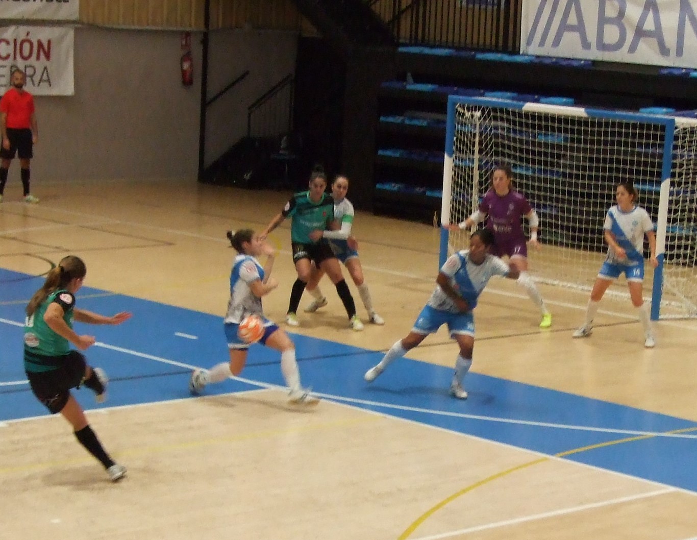 Incidencias: Pabellón de A Raña de Marín. Encuentro de la novena jornada de la Primera División Femenina de Fútbol Sala. Cerca de 150 aficionados en las gradas. El conjunto local, jugadoras y técnicos se posicionaron contra la violencia de género antes de iniciarse en partido