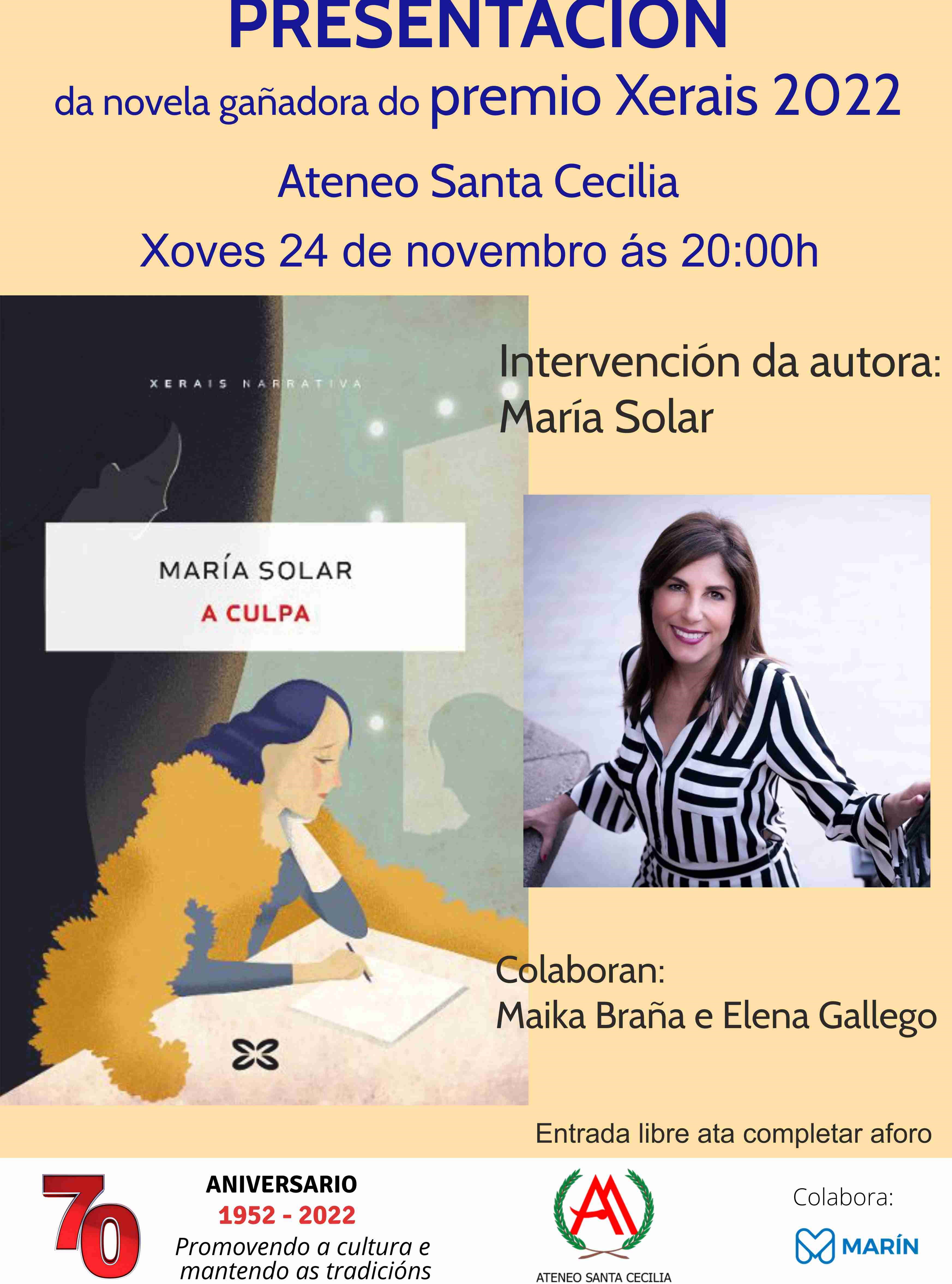 A las ocho de la tarde se iniciará el acto de presentación del libro de María Solar, “A Culpa”, acto correspondiente a la programación del setenta aniversario de la fundación del Ateneo Santa Cecilia, antes Asociación de Cultura y Arte del mismo nombre, ocurrida el 22 de noviembre de 1972 tras un homenaje religioso a los músicos de Marín.