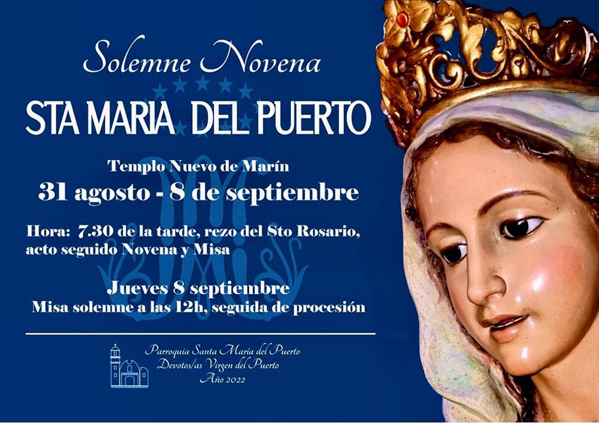 La parroquia Santa María del Puerto anuncia ya la celebración de la Patrona de Marín, Santa María del Puerto, que tendrá lugar el próximo día 8 de septiembre y, como paso previo, se empezará la celebración del novenario en su honor el miércoles día 31 de este mes de agosto.