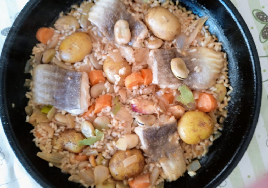 Dejamos que se evapore el alcohol y cubrimos con agua. Cuando empiece a hervir y la patata esté a mitad de cocción, incorporamos un puñado de arroz o medio y dejamos que siga hirviendo. No queremos hacer un arroz de verduras, sino un arroz al escondite. Cuando la patata esté casi, casi hecha, es el momento de meter la maruca, que tenemos previamente areada, junto con los guisantes. Con la tapa puesta para ver cómo se va haciendo al vapor el pescado.