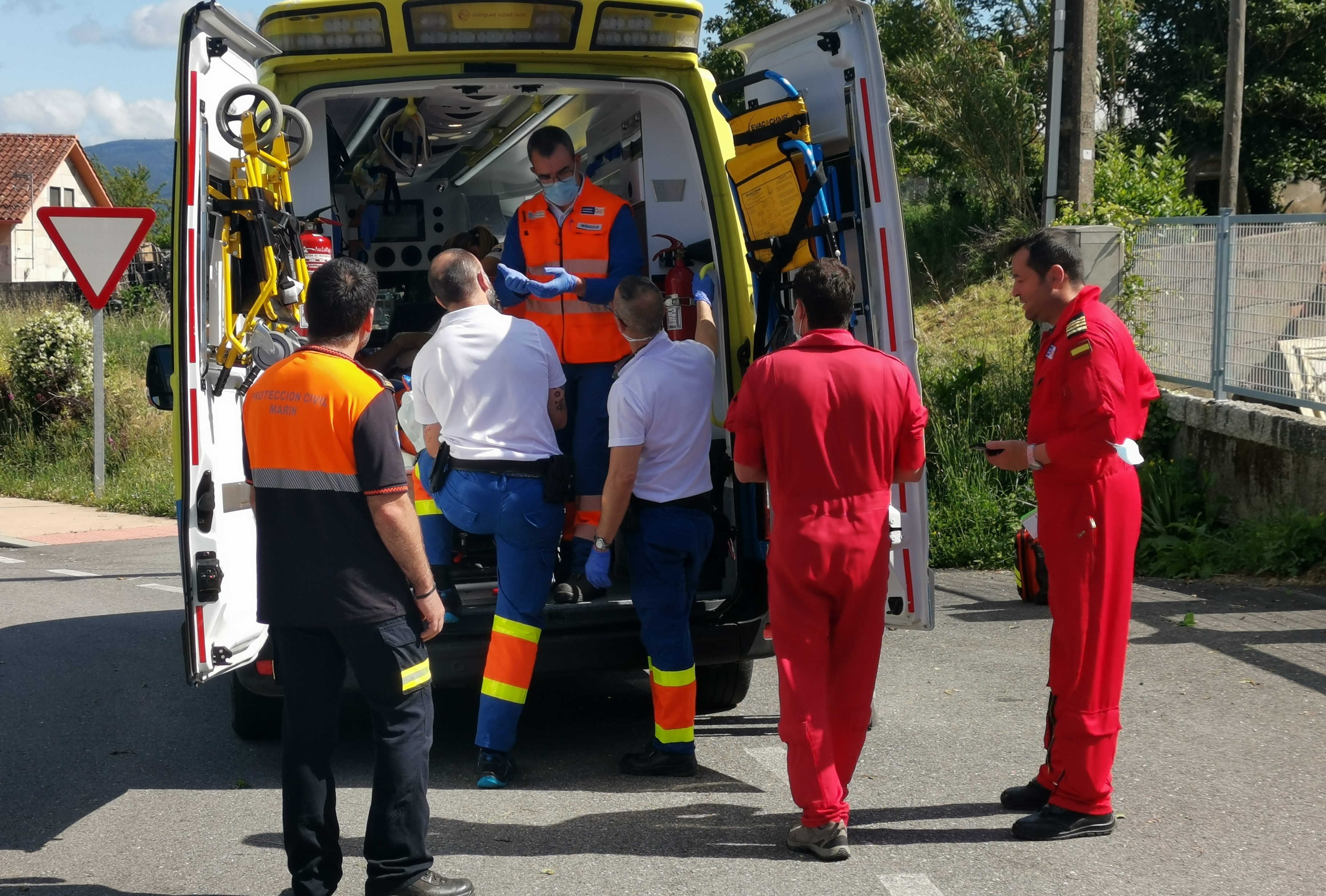 Una vez conocida la incidencia, los servicios de emergencia se trasladaron al lugar; los equipos médicos de la ambulancia dieron aviso al servicio aéreo de transporte médico dada la gravedad de las heridas del trabajador afectado. En principio se barajaron dos posibles ubicaciones de aterrizaje del helicóptero, el Puerto de Marín o un campo de fútbol abandonado que existe en San Xulián, pero la tripulación decidió, después de una observación en el entorno que una finca situada en las inmediaciones de una fábrica de poliéster era el lugar adecuado.
