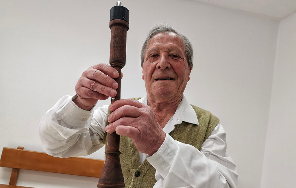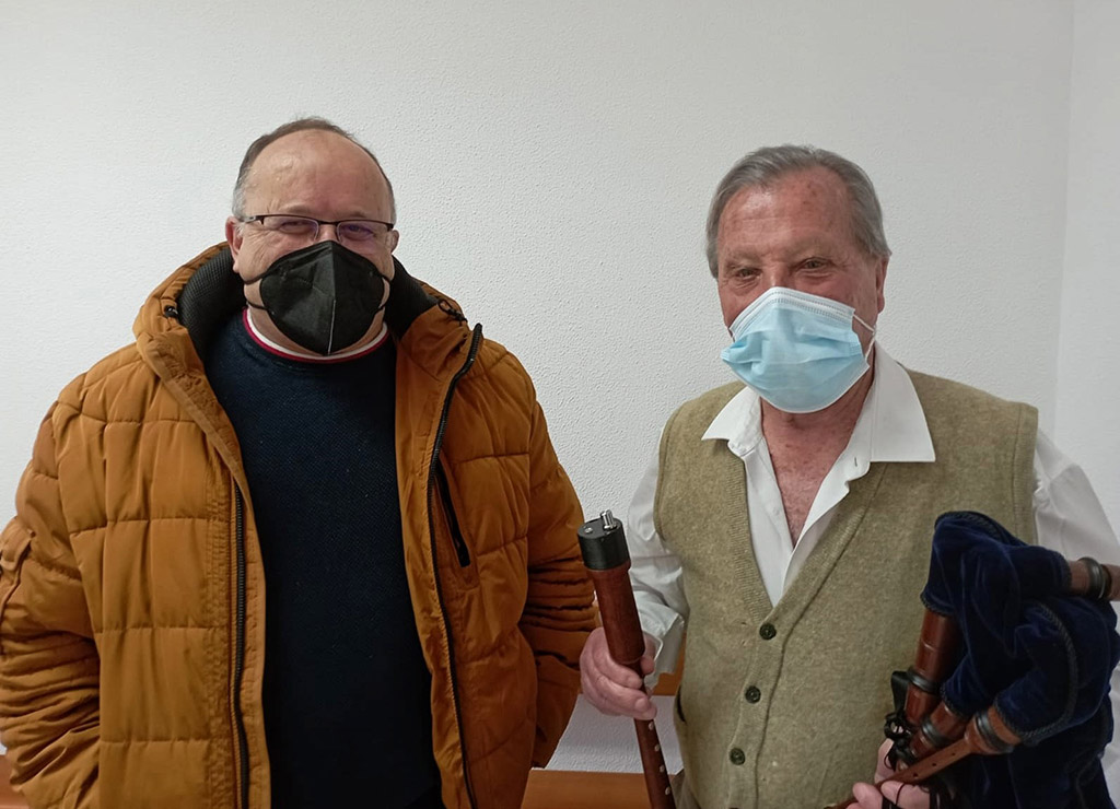 Hace un tiempo se incorporó a las clases de animación con música llamado "Música e felicidade" que ofrece Nelson Quinteiro en el Centro Sociocomunitario de Marín, y le contó con cierta amargura que no podía desarrollar una de sus actividades preferidas porque molestaba al resto de residentes del centro. Él era muy consciente del problema de convivencia que causaba a sus vecinos, por lo que aparcó la gaita, -salvo algunas veces que bajaba a la cafetería-, hasta que Nelson apareció esta mañana con Ramiro, representante de la empresa Insogaita de Cangas que de dedica a fabricar accesorios para este instrumento típicamente gallego, que traía para él un punteiro electrónico, una maravilla al que se puede regular el volumen, la tonalidad de la gaita e incluso incorporar otros sonidos como el del ronco para simular que toca una gaita completa.