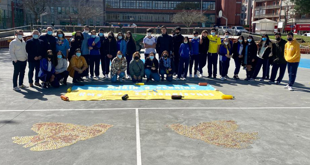 Tal y como informábamos en días pasados y después de haberse pospuesto en un par de oportunidades por motivos de la climatología, el acto en favor de los refugiados ucranianos organizado por el Colegio Inmaculada pudo celebrarse en la mañana de ayer en las inmediaciones del Parque Eguren. El nivel de colaboración del pueblo marinense fue máximo y el objetivo económico se cumplió en mucho menos tiempo del previsto; al final de la campaña, los participantes posaron para la imagen con dos palomas hechas con monedas símbolo de la pretendida PAZ y reivindicando que de una vez concluya esta barbarie.