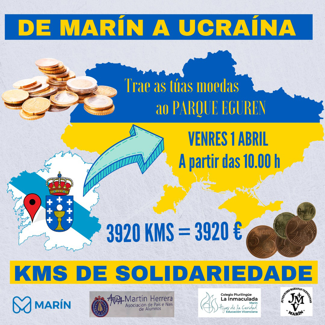 "Xa pasou un mes desde que o exército ruso iniciou a invasión de Ucraína e, aínda que temos a esperanza de que a guerra cese, seguimos impactados ante as terribles imaxes de sufrimento que está a padecer o pobo ucraíno, entre eles moitos nenos e nenas. Porén, estamos vendo tamén mostras enormes de solidariedade e apoio por parte de moitas persoas conmovidas ante o que está a ocorrer. Nesta situación non podemos quedar impasibles ante tanto sufrimento. Por iso, desde o COLEXIO e en colaboración coa ANPA MARTÍN HERRERA, queremos sumarnos a esta “marea de axuda” organizando unha ACTIVIDADE SOLIDARIA á que chamamos “QUILÓMETROS DE SOLIDARIEDADE”. A actividade consistirá en recorrer simbolicamente con MOEDAS os quilómetros que nos separan de UCRAÍNA favorecendo un “Corredor Humanitario” co que queremos mostrar a nosa solidariedade con este país que sofre as consecuencias dunha terrible guerra; un xesto que demostre que o noso corazón está co pobo ucraíno e con tantos inocentes que teñen dereito a medrar en paz. A actividade desenvolverase o VENRES 1 de ABRIL a partir das 10.00h NO PARQUE EGUREN (garantindo as medidas COVID de seguridade). Os alumnos e demais persoas que se acheguen irán completando coas súas moedas eses 3.920 kms que nos separan de Ucraína Neste momento a axuda económica é fundamental, xa que hai grandes dificultades para facer chegar de forma rápida todo o que se está a recoller (roupa, alimentos, medicinas...), ademais do custe económico que iso supón. Por outra banda, os refuxiados que logran saír do país necesitan axuda inmediata para sobrevivir e viaxar a lugares máis seguros. Compartir fainos mellores persoas a todos. Como docentes, pais e nais é, ademais, unha gran oportunidade para reflexionar cos nosos alumnos e fillos sobre a situación que viven outros nenos, sensibilizalos e ofrecerlles a posibilidade de aportar o seu gran de area nesta traxedia na que todos nós debemos estar unidos. GRAZAS POLA VOSA COLABORACIÓN"