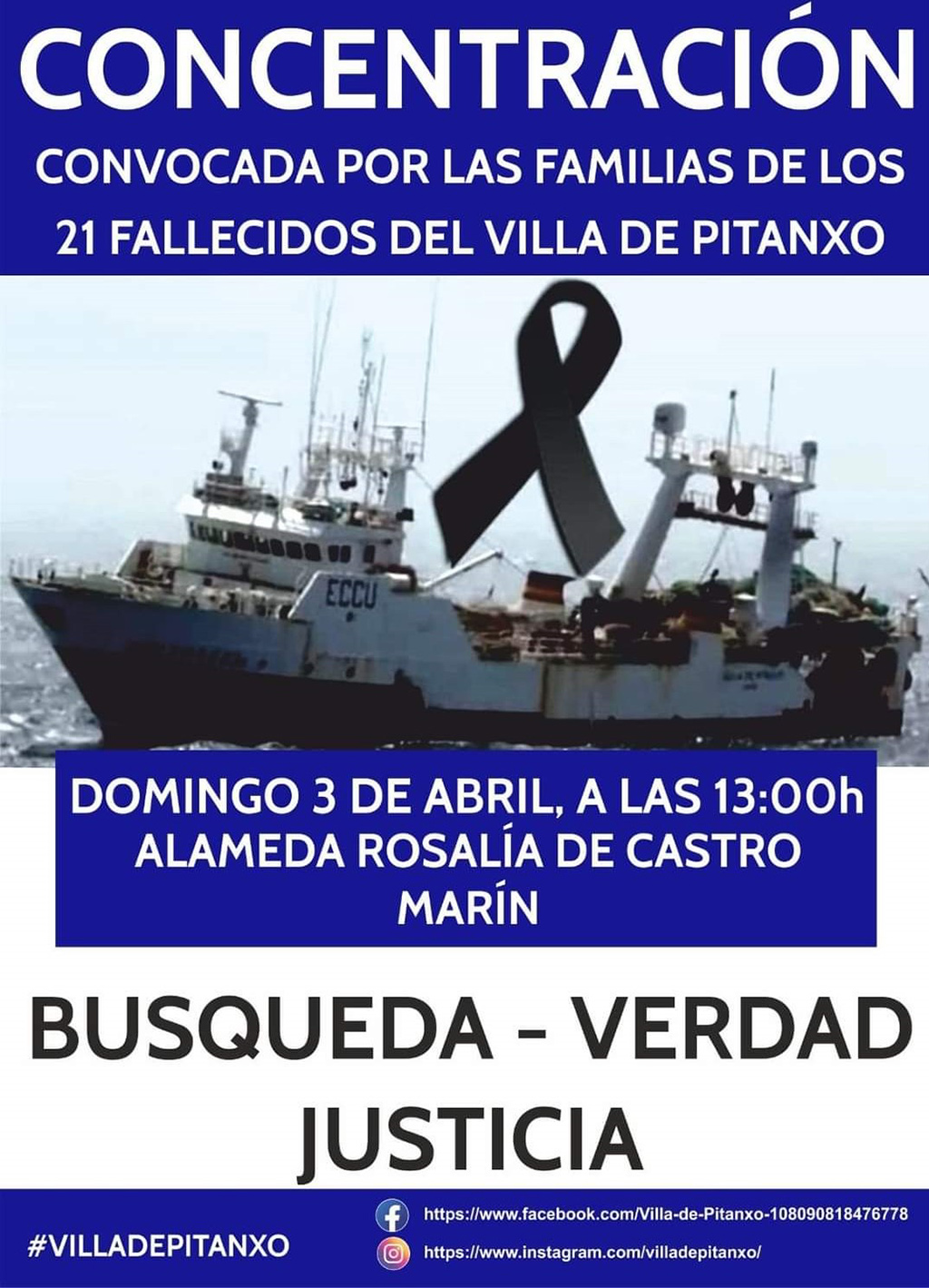 Pedimos por tanto, que el Gobierno cumpla el compromiso adquirido de adoptar todas las medidas necesarias para que se realice una valoración y reconocimiento de la situación del VILLA DE PITANXO. Esto debe hacerse por la memoria de los VEINTIÚN FALLECIDOS, sus familiares y por los marineros que España tiene bajo su bandera en todos los mares del mundo. También es necesario cumplir con el compromiso de esclarecer las causas de esta tragedia con el fin de hacer justicia”.
