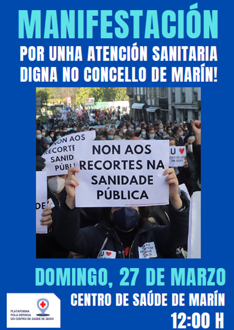 Nese sentido, Convócase unha manifestación o 27 de marzo, con saída ás 12 do Centro de Saúde de Marín en defensa dunha atención primaria digna e contra os recortes nas urxencias e nos Centros de Saúde de Seixo e Marín porque a presión e a unión da xente é a única maneira de parar o desmantelamento da sanidade pública. A veciñanza de Marín ten que lembrarlle unha vez máis á Xunta que coa nosa saúde non se xoga.”