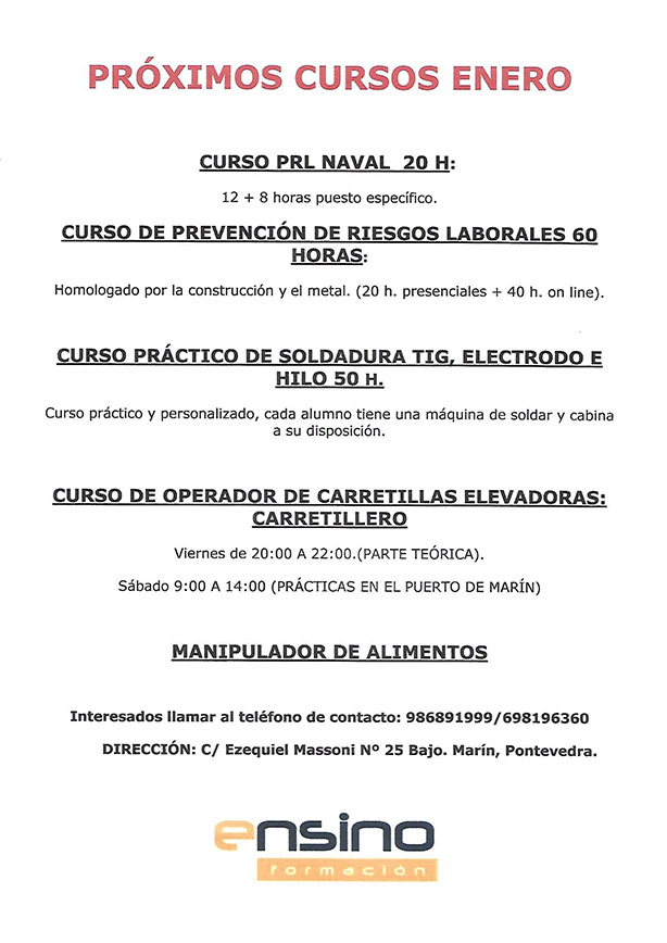 Con el inicio del mes de enero se empieza también en la Academia ENSINO de Marín la oferta de una serie de interesantes cursos de formación para las personas que se sientan atraídas por sus respectivos contenidos
