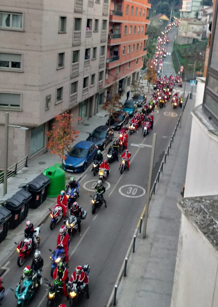 Nunca se habían reunido tantos papanoeles motorizados en Marín como ayer en que, puntualmente a la hora prevista y tras concentrarse en las proximidades de la Plaza de España, salieron de ruta por el vial de playas y el rural marinense llevando la imagen navideña a todas partes.