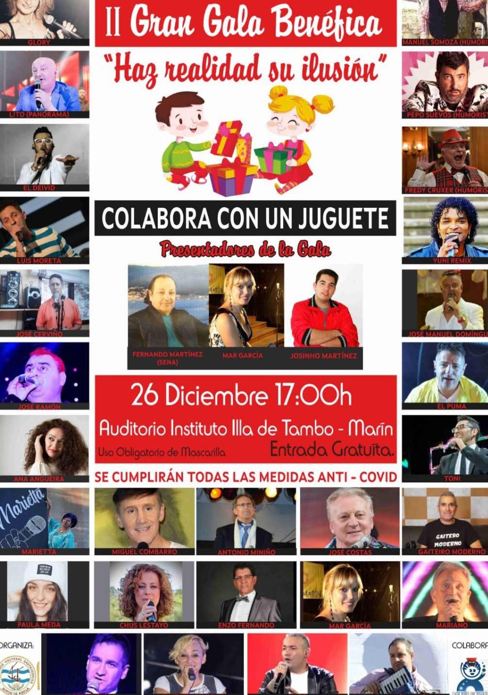 Tras recibir una donación de mil juguetes procedentes de una asociación viguesa, la marinense Botón de Ancla que preside Manuel Area Extremera, se dispone a celebrar la “II Gran Gala Benéfica” en la que actuarán más de veinte cantantes y humoristas en el paraninfo del Instituto Illa de Tambo con entrada libre hasta completar aforo y la petición de entrega de un juguete que, junto con los ya recibidos comentados anteriormente, serán destinados a las familias más necesitadas para que sus hijos puedan disponer de juguetes en estas fiestas navideñas.