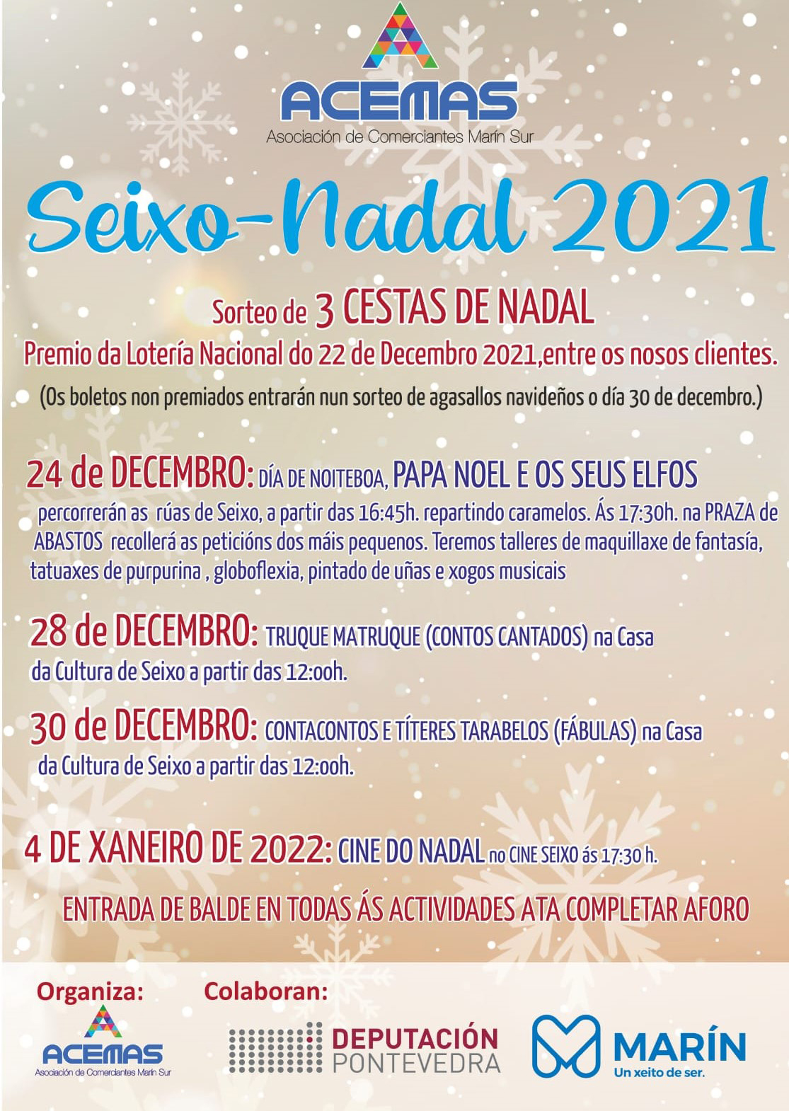 El día 24 Papá Noël acompañado de algunos de sus elfos recorrerá Seixo desde las cinco de la tarde, antes de sentarse en un trono que le será colocado en el mercado donde lo podrán saludar los niños y las niñas que deseen estar con él para contarle sus “cositas”. Mientras tanto habrá animación con actividades preparadas por monitores para los más pequeños con globoflexia, maquillaje y demás motivos lúdicos.