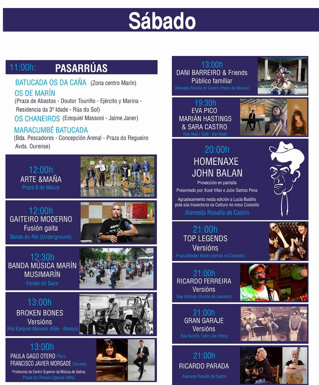 A partir de las 12 se iniciará el concierto de “Arte Maña” en la plaza “8 de Marzo”. Al mismo tiempo será el “Gaiteiro Moderno” que actuará en la Lameira, ante el Underground, frente al anexo sur de la plaza de abastos.; Media hora más tarde, la banda de música “Musimarín” actuará en Fondo do Saco; A la una, en Ezequiel Massoni (Antigua Casa do Mar), el grupo de versiones “Broken Bones”; Al mismo tiempo en la Rúa do Sol, actuará el dúo Paula Gago al piano y Francisco Javier Morgade al clarinete y también, en la alameda Rosalía de Castro, palco de la música, Dani Barreiro&Friends.