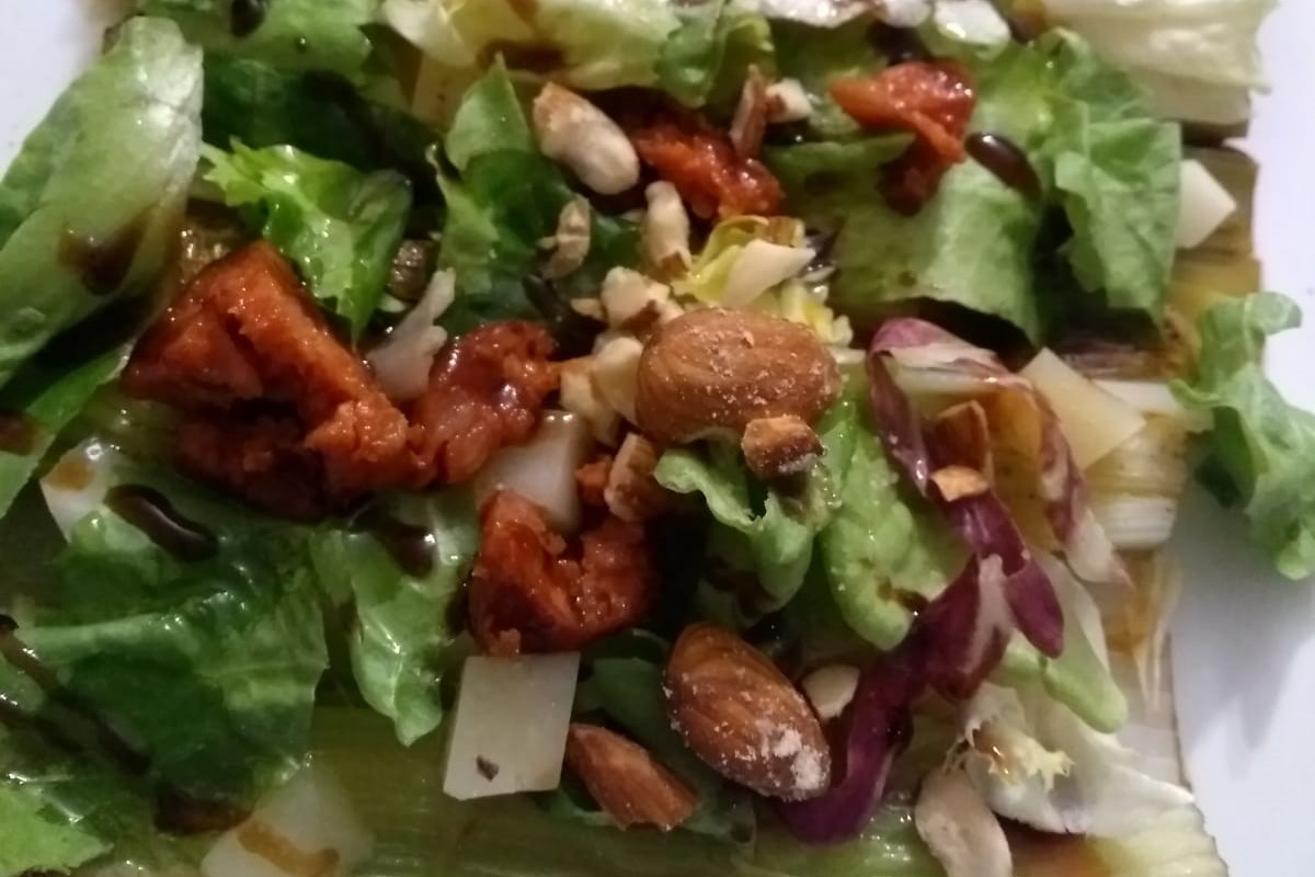 Pues, ensalada templada de puerros a la brasa y almendra