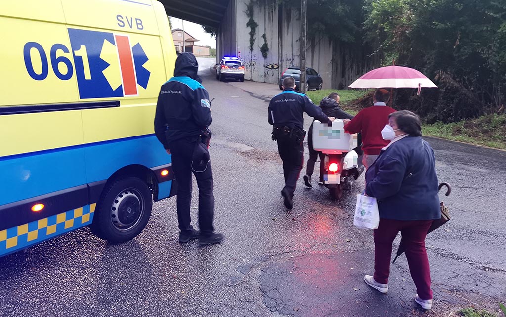 El conductor de una motocicleta eléctrica que presta servicio para una empresa marinense de reparto a domicilio fue trasladado al Hospital Montecelo después de accidentarse en un cruce de A Brea, bajo el trazado de la variante de Marín. Según fuentes consultadas, tenía heridas leves en varias partes del cuerpo, y aunque preventivamente los servicios de emergencia colocaron un collarín de protección en su cuello por si tuviera lesiones más graves.