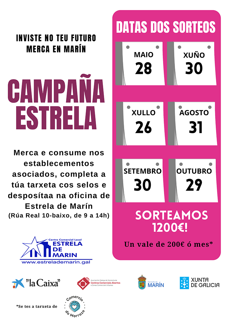 Una nueva campaña de promoción comercial se inicia en Marín con la que el “Centro Comercial Aberto” Estrela de Marín quiere premiar la fidelidad de sus clientes fomentando las compras en los establecimientos asociados a este entidad local. Se trata de la decimotercera edición de la “Campaña Estrela” cuya dinámica nos explica el gerente del grupo y además presidente de los Centros Comerciales Abiertos de Galicia, Jonathan Carreira: “É moi sinxela, polas compras efectuadas, os clientes recibirán unha tarxeta que contará con 3 recadros en branco por un lado, e cun apartado para os datos do cliente polo outro. Nestes recadros, cada establecemento selará (unha única vez en cada tarxeta) no momento de realizar a compra ou o consumo por parte do cliente. Unha vez que o cliente complete a tarxeta cos tres selos de outros tantos establecementos e cos seus datos persoais, deberá depositala na urna sita na sede social para poder participar no sorteo”.