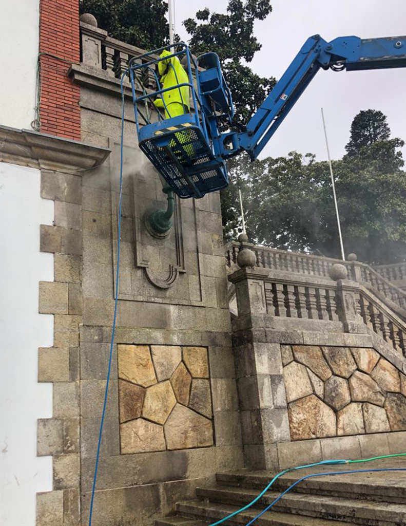 La empresa aplica un desincrustante y a continuación la piedra se limpia de manera cuidadosa con agua caliente a baja presión para no hacer daño a la integridad de los muros. Es un trabajo muy específico que se realiza con pistolas hidráulicas de aplicación que pueden variar la presión según la necesidad de cada tipo de material.