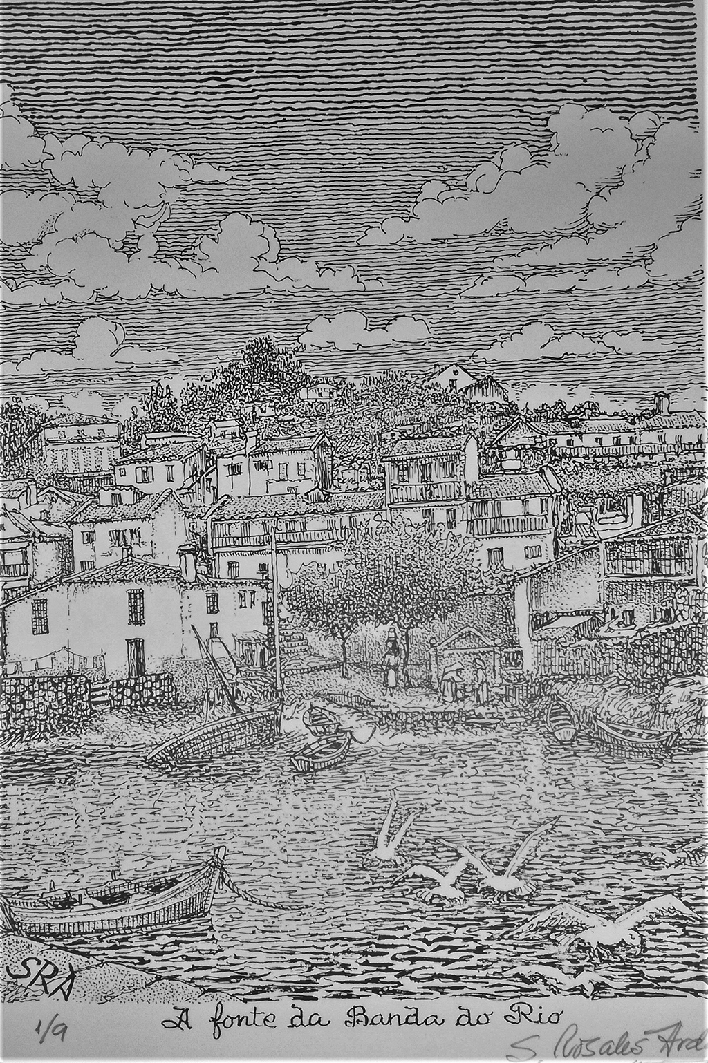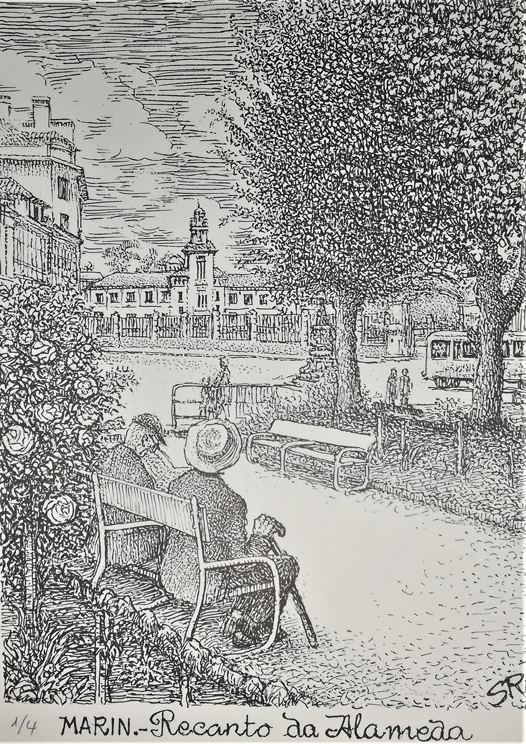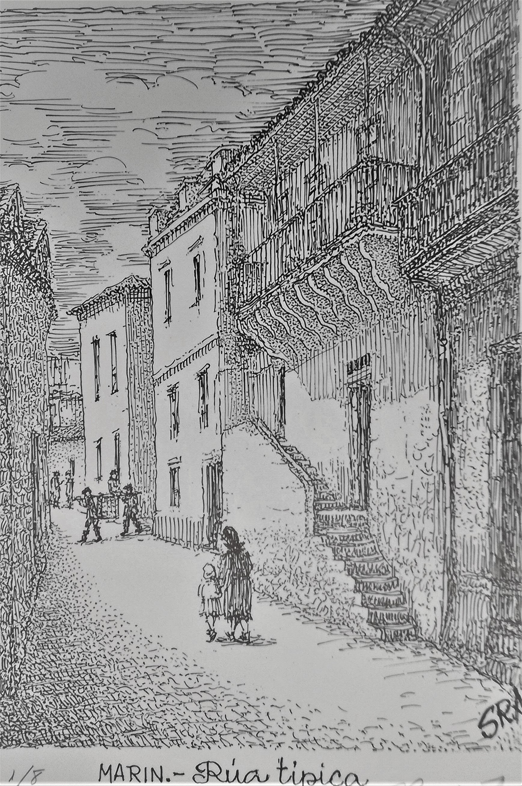 Es el caso de Santiago Rosales Ardá dibujante sin igual, nacido en A Mouta y que, tras vivir en muchos puntos de España por obligación de su trabajo profesional, acabó su vida en Poio, donde residía con su familia. En algunos lugares públicos de Marín cuelgan en sus paredes dibujos a plumilla de extraordinaria calidad que recogen rincones e imágenes con la sencilla firma SRA. Yo que tuve la satisfacción de entrevistarlo en su casa, poco antes de fallecer, para el medio en el que trabajaba, le ví emocionarse al hablar de su pueblo natal y comprendí que aquella mole de hombre, que por los dos metros de altura andaría, sentía la cósmica necesidad de hablar, con sus dibujos, de su pueblo natal, Marín.