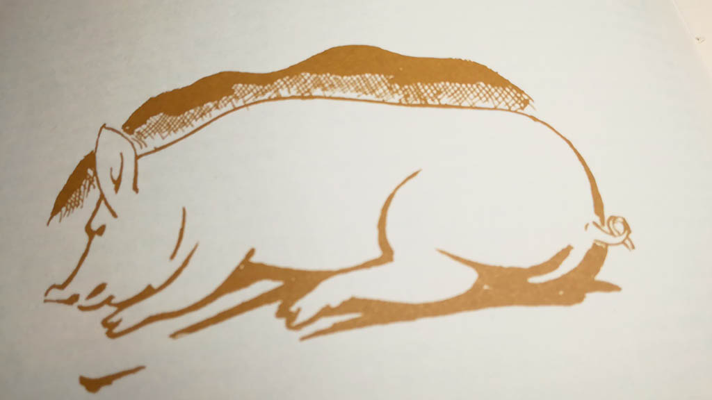 ¡Ouh porco, porco!, verba ademirativa ceibada pola gula encachoupada en todolos recantos do bestial anceio de comer. ¡Ouh porco, porco! Abenzoado polas gorxas emporcalladas de grasa, cinguida a súa papada co babeiro da cursidá na rolda algareira dos xantares padroales. Abenzoado nas rituales laconadas do Antroido, remollado co adobo tintoreiro dos espritosos zumes das parreiras. Abenzoado nos tobos urbáns da gastronomía, escearios das suculentas lobadas, despensas da túa inmortal sustancia, soerguendo de cote o anceio das túas xugosas frebas. Abezoado no esquesito Salón de Te polo coro de donas de epigástrica beleza que antre louba e louba papan as lonxas da túa rosada suculencia e poñen no engulimento o acorante anceio de connvertir en carne propia a esencia basta e aldeán das túas talladas.