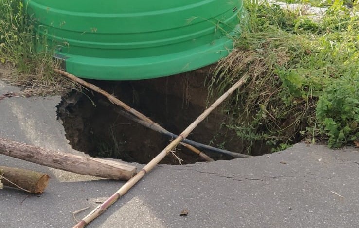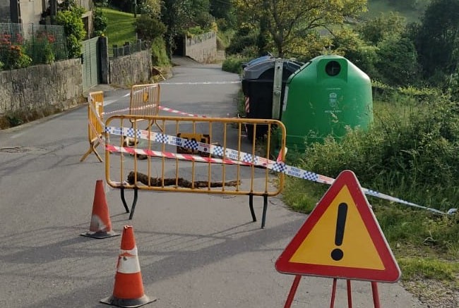 Una antigua mina de agua en desuso que discurría bajo una carretera en Santomé provocó en el día de ayer un gran socavón de más de dos metros de profundidad, según informan servicios municipales. En un primer momento, y ante su peligrosidad para conductores, los vecinos de la zona procedieron a señalizarlo con palos y piedras; una vez personada la Policía Local se procedió al vallado y señalización para evitar que cualquier persona despistada pudiese caer en el interior del hoyo. Se da la circunstancia de que el agujero se abrió en un lugar muy próximo a un contenedor de vidrio que tuvo que ser apartado para que éste no fuera "engullido" en el hueco creado por el discurrir de agua subterránea.