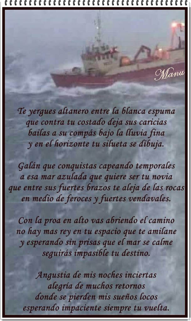 Recibimos en Carriola e Marín otros dos poemas de Manola Vázquez, autora de cientos de poesías y trabajos literarios impregnados en el mar y las cosas que en ese medio ocurren que afectan muy de cerca a su espíritu poético. Pues aquí los dejamos una vez más para satisfacción de sus muchos seguidores.