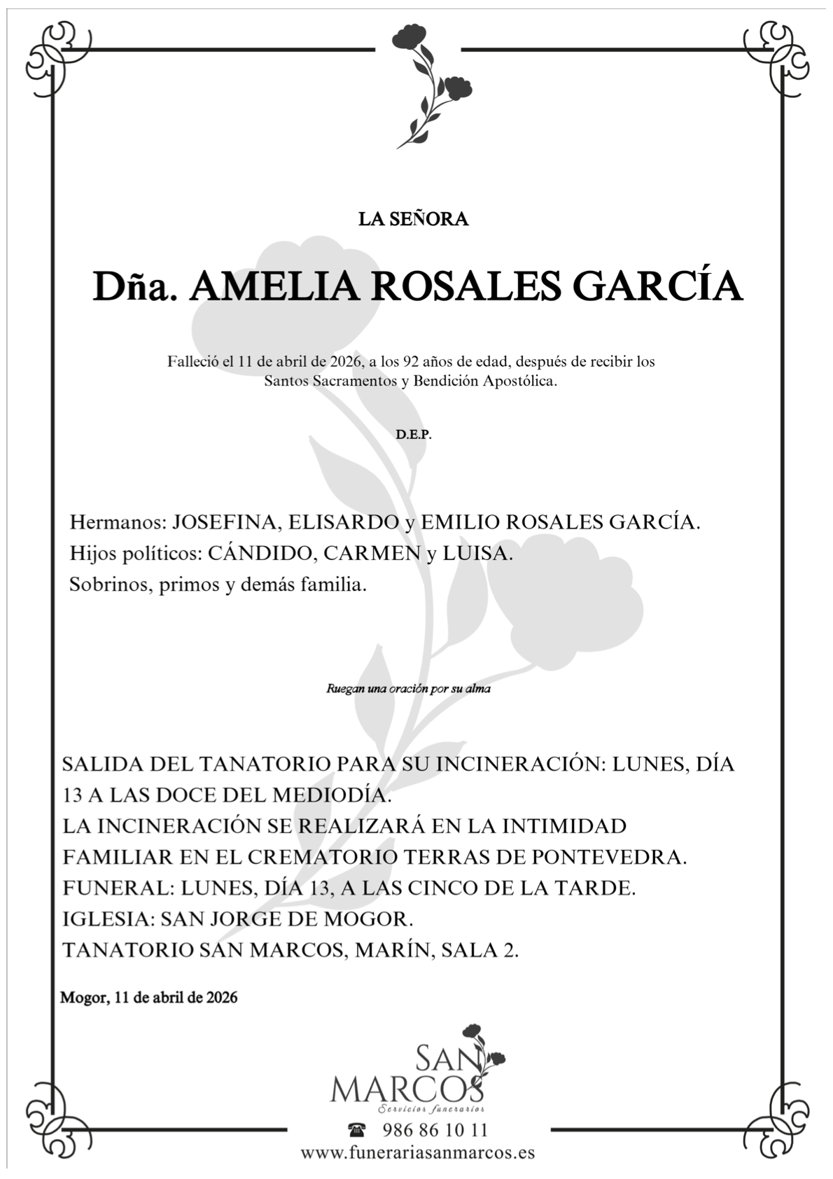 La funeraria SAN MARCOS comunica el fallecimiento HOY, día 11 de abril de doña  AMELIA ROSALES GARCÍA cuyos restos mortales permanecerán en el Tanatorio San Marcos, de Marín, sala número 2, hasta el momento de su traslado, el próximo LUNES día 13 a las DOCE del mediodía al crematorio Terras de Pontevedra para si incineración en la intimidad familiar.