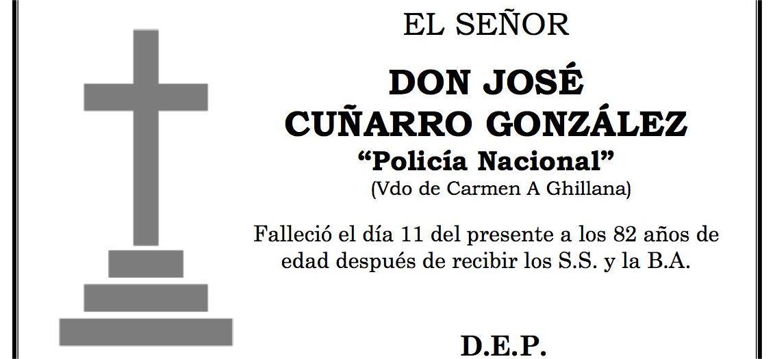 La funeraria LA FE comunica el fallecimiento HOY, día 11 de abril de don JOSÉ CUÑARRO GONZÁLEZ cuyos restos mortales permanecerán en el Tanatorio San Marcos, de Marín, sala número 1, hasta el momento de su traslado mañana DOMINGO día 12 a las SIETE de la tarde al cementerio municipal de A Raña para su inhumación.