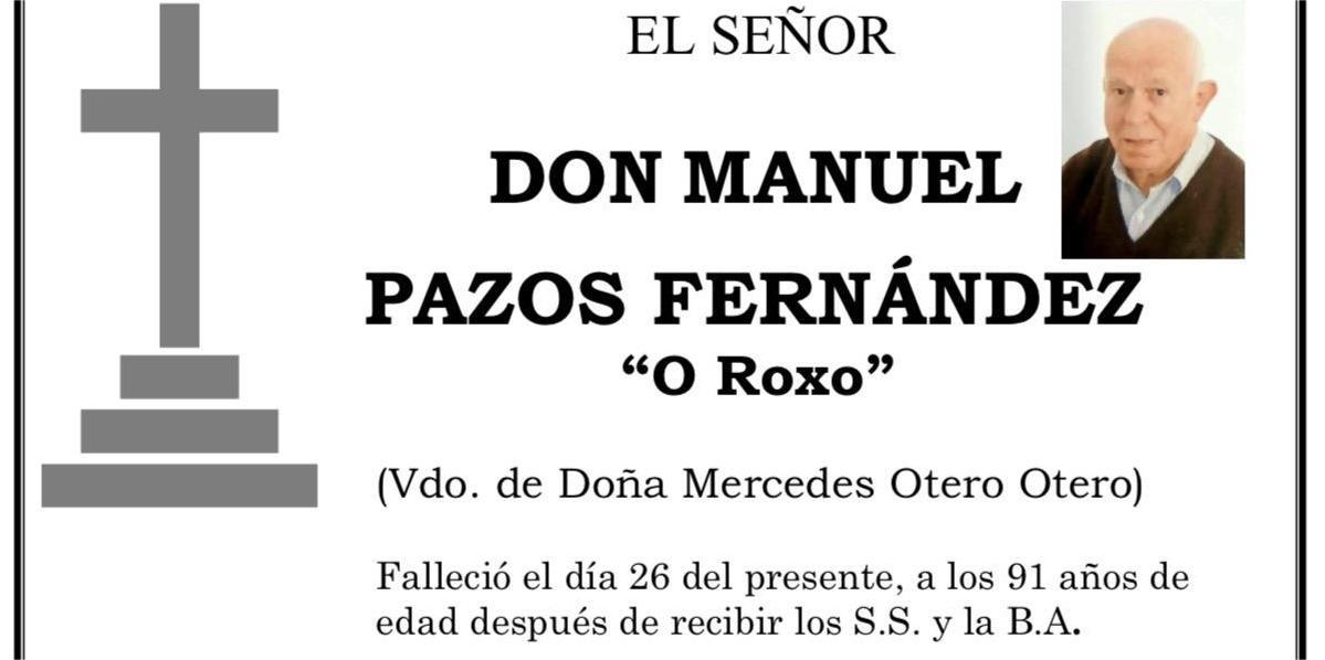 La funeraria LA FE comunica el fallecimiento de Don MANUEL PAZOS FERNÁNDEZ (O Roxo) cuyos restos mortales permanecerán en el tanatorio SAN MARCOS de Marín, sala número 1, hasta el momento de su traslado al cementerio municipal de San Andrés de Lourizán, mañana lunes día 27 a las cinco y media de la tarde