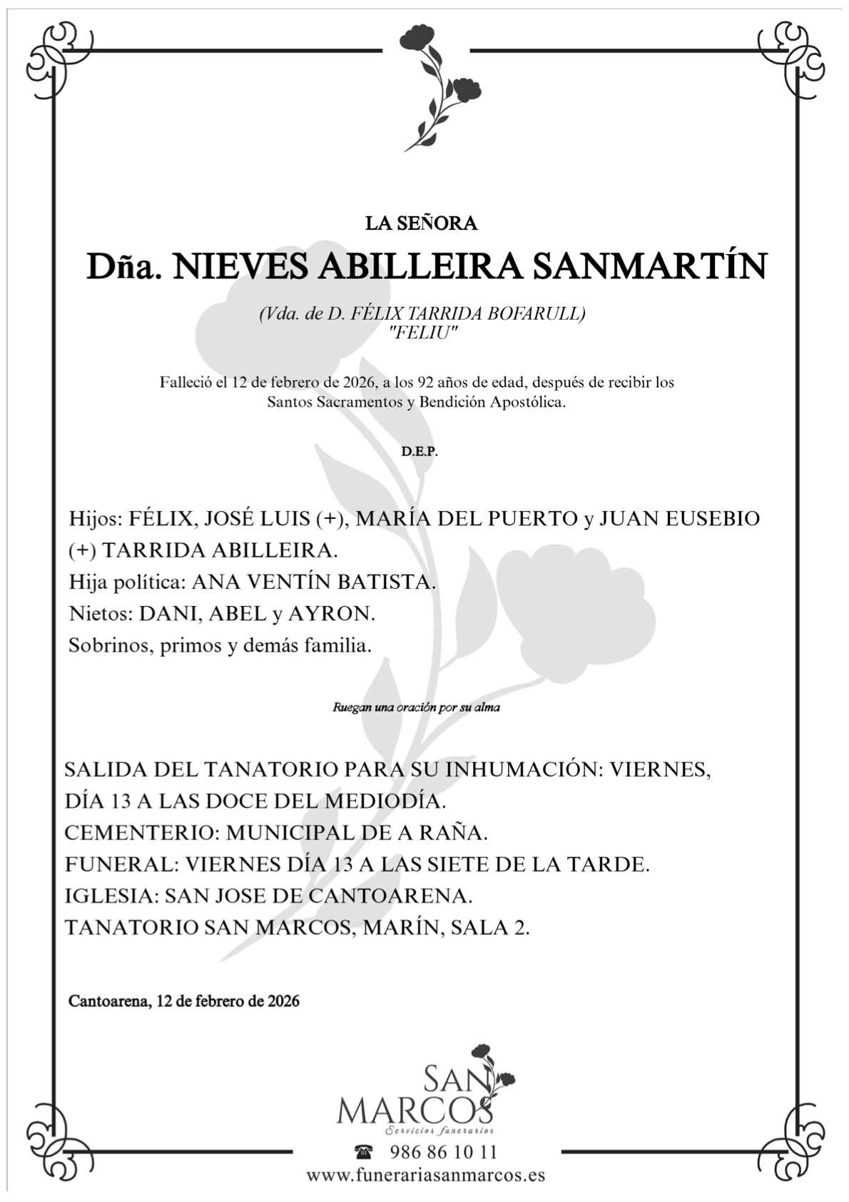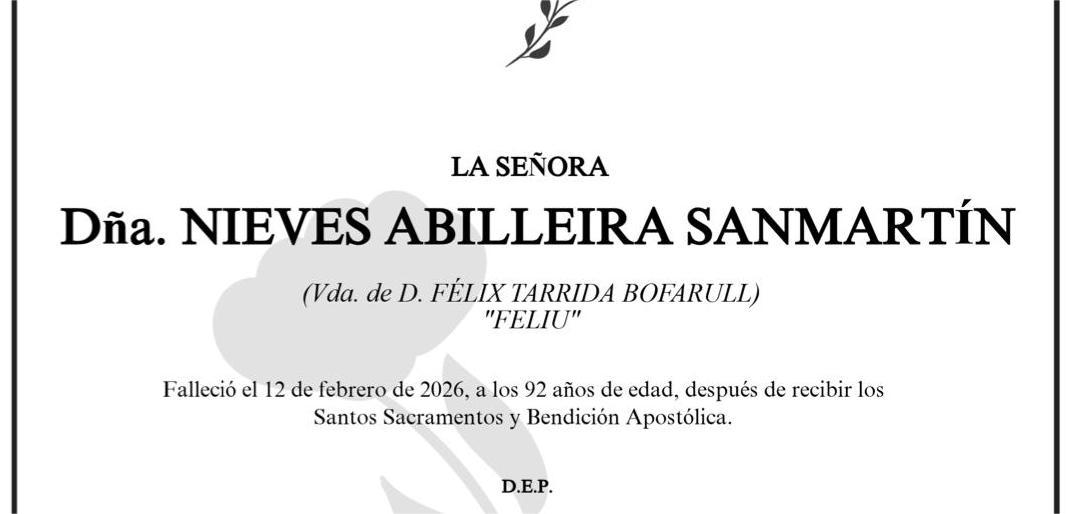 La funeraria San Marcos comunica el fallecimiento hoy, día 12 de febrero, de doña NIEVES ABILLEIRA SANMARTÍN cuyos restos mortales permanecerán en el tanatorio San Marcos, de Marín, sala número 2, hasta el momento de su traslado, MAÑANA viernes día 13 a las DOCE del mediodía al cementerio municipal de A Raña para su inhumación.