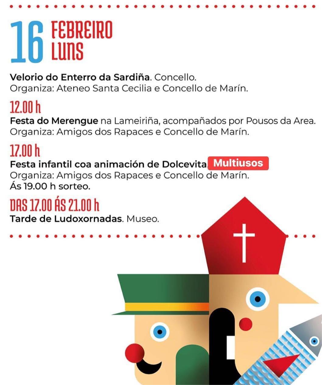 Y para cumplir la tradición, el Ateneo mantiene la celebración el miércoles, con salida a las ocho de la tarde independientemente de las condiciones climáticas. Catafalco con sardina acompañado de estandartes y personajes varios del escarnio procesional, saldrán del palco de la música Jaime Janer arriba hacia “Busto de Abaixo” retornando por Dr. Touriño y Rúa do Sol hasta la escalinata de la plaza del Reloj donde se procederá a la lectura del sermón y la letanía que comienza con lo de “Un ollón -dous ollóns - tres ollóns- catro ollóns y sincollóns” para continuar evocando a cuanto peixe de mejor o peor calidad existe en el mar. Terminado sermón y letanía la sardina sera llevada hacia el puerto donde, en el paseo marítimo será arrojada al mar como manda la tradición.