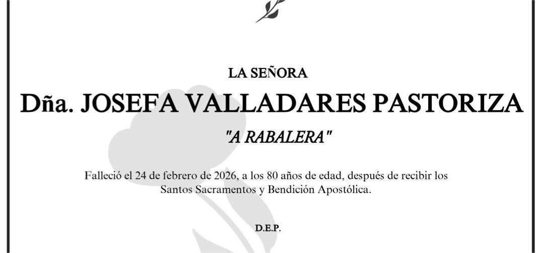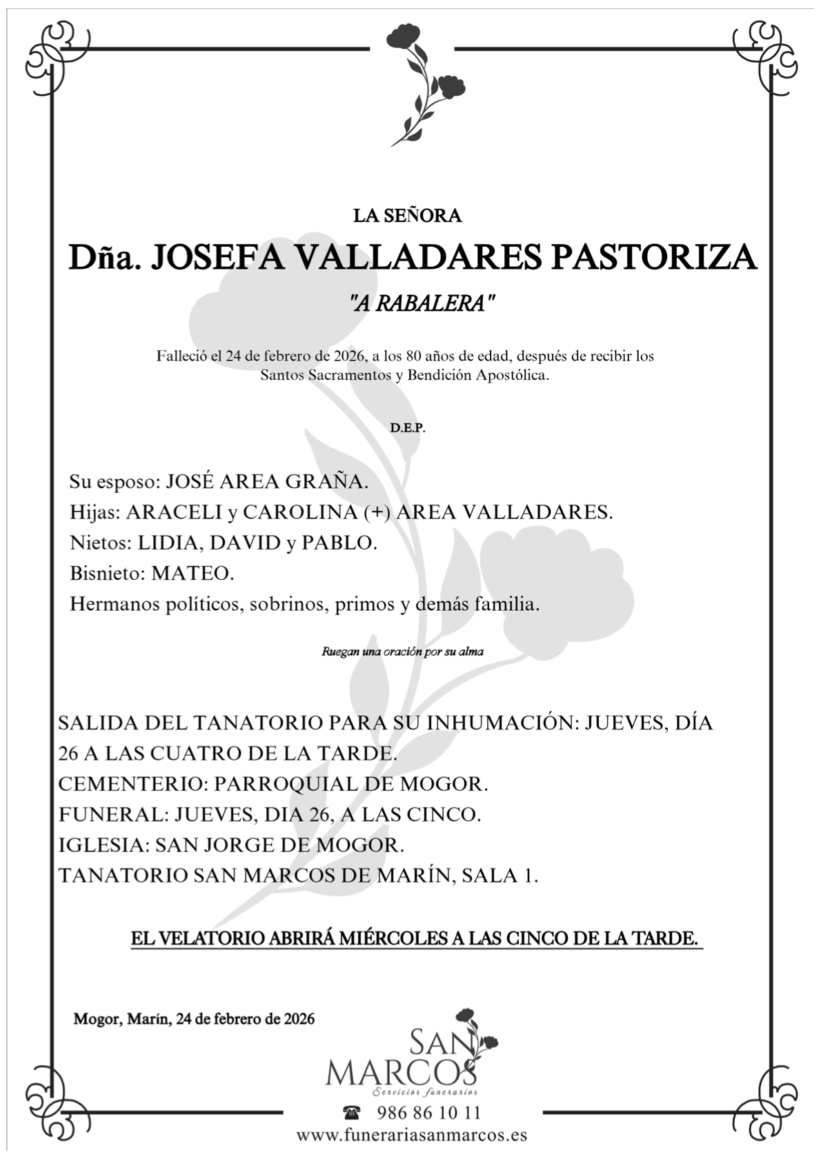 La funeraria San Marcos comunica el fallecimiento hoy, día 24 de febrero, de doña JOSEFA VALLADARES PASTORIZA cuyos restos mortales permanecerán en el tanatorio San Marcos, de Marín, sala número 1, hasta el momento de su traslado el JUEVES día 26 a las CUATRO de la tarde al cementerio parroquial de Mogor para su inhumación.