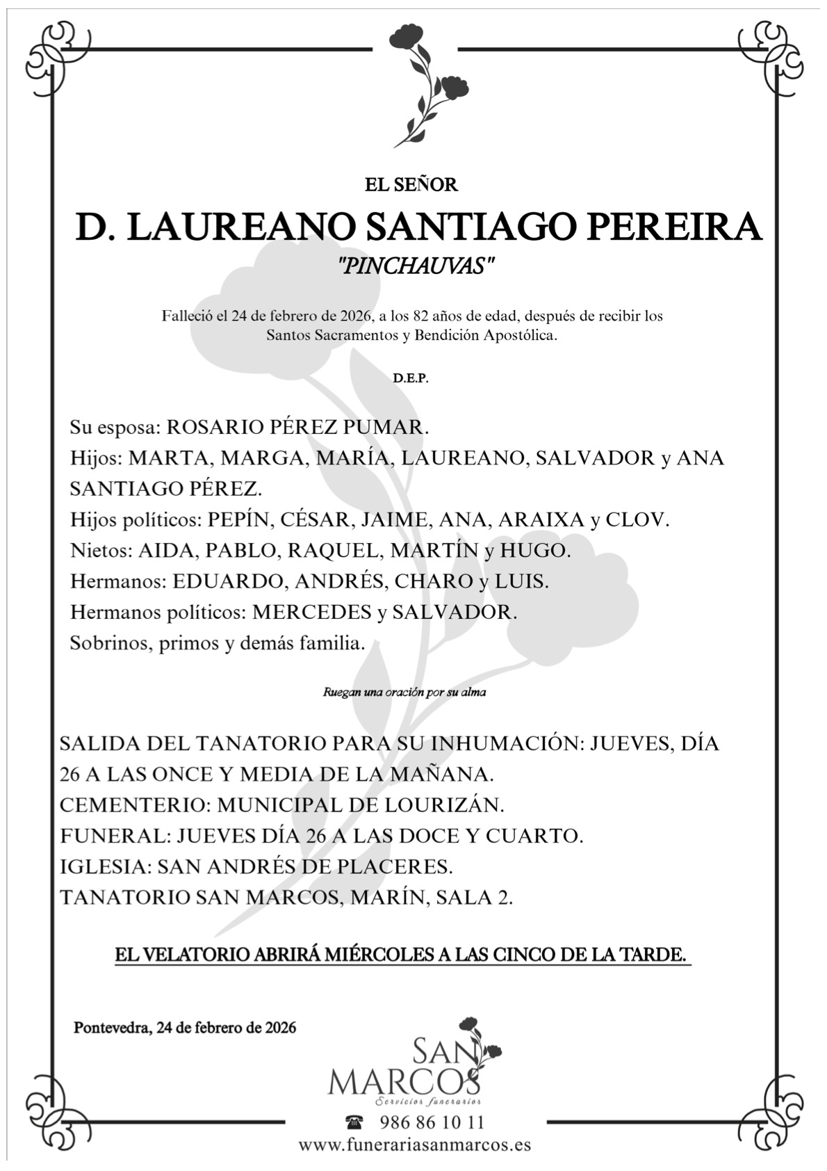 La funeraria San Marcos comunica el fallecimiento hoy, día 24 de febrero, de don LAUREANO SANTIAGO PEREIRA cuyos restos mortales permanecerán en el tanatorio San Marcos, de Marín, sala número 2, hasta el momento de su traslado el JUEVES día 26 a las ONCE Y MEDIA de la mañana al cementerio municipal de Lourizán para su inhumación.