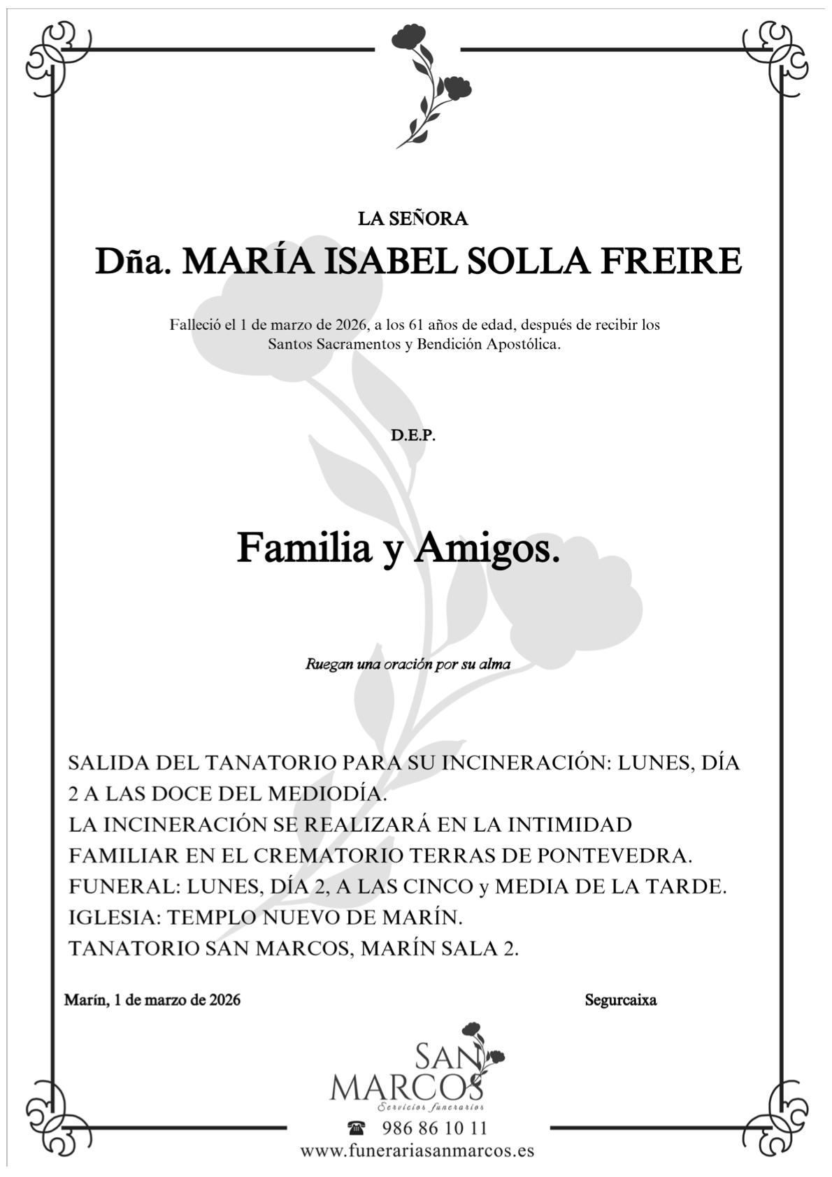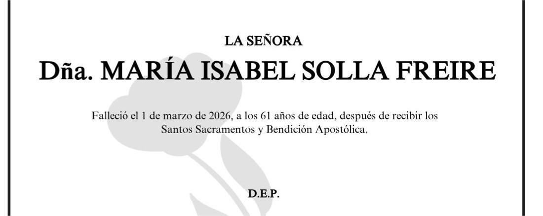 La funeraria SAN MARCOS comunica el fallecimiento hoy, día 1 de marzo, de doña ISABEL SOLLA FREIRE cuyos restos mortales permanecerán en el tanatorio de Marín, sala número 2, hasta el momento de su traslado mañana lunes día 2 a las doce del mediodía al crematorio Terras de Pontevedra para su incineración.