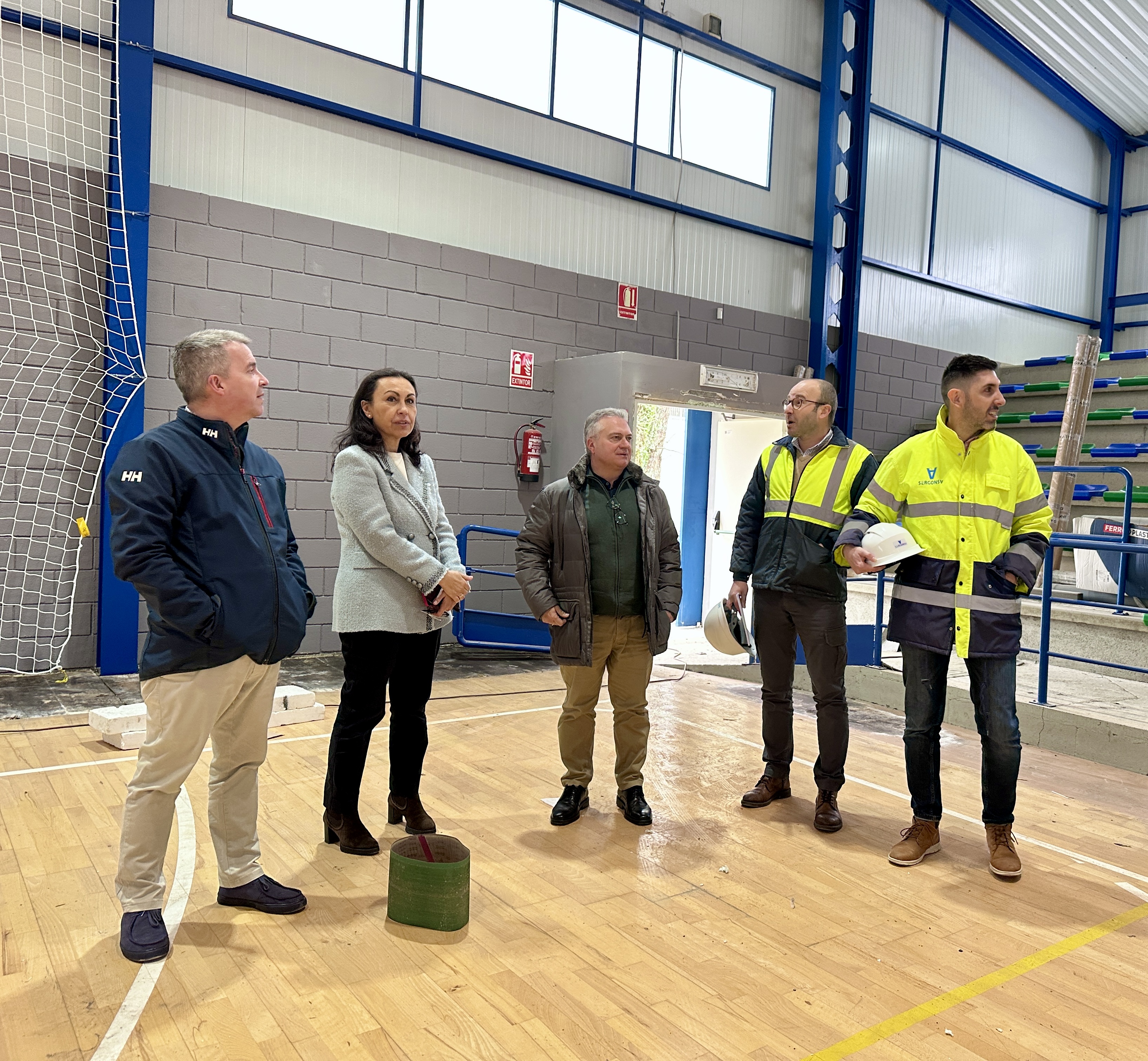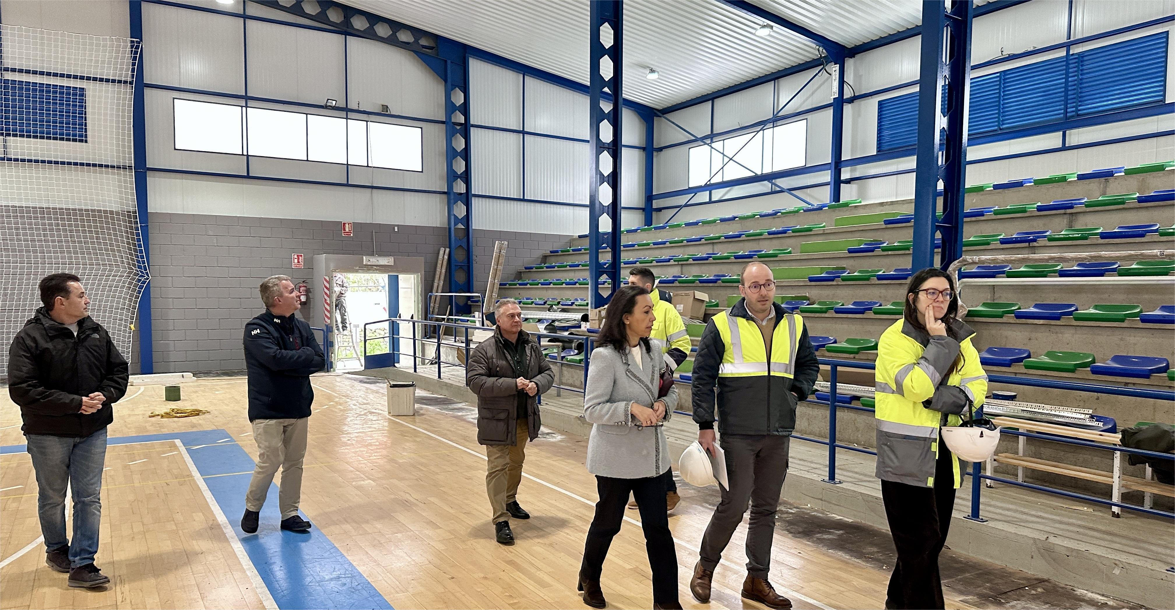 Según se especificó durante la visita, “Os traballos están moi avanzados, coa cuberta xa totalmente renovada, as novas luminarias LED instaladas, o repintado interior e todo o illamento da envolvente, para o que utilizou SATE, e tamén se cambiaron as canalizacións e as ventás nos vestiarios e agora están traballando na mellora da pista, pulíndoa e renovando o seu perímetro. retirando a tarima para poñer un material PVC resistente e con durabilidade”.