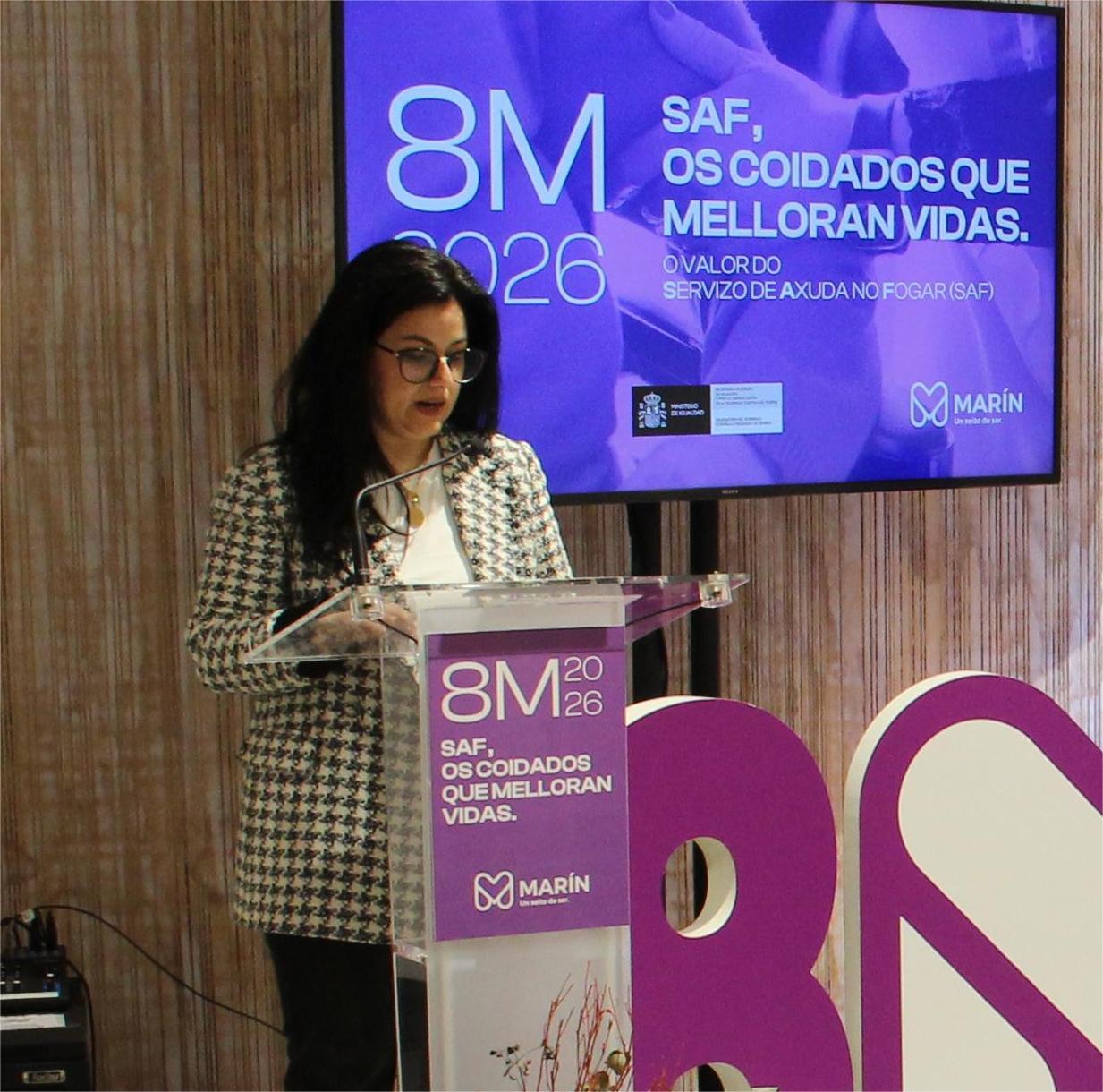 Seguidamente se refirió al sentido del homenaje que este año se rinde a un colectivo especial de mujeres por el servicio que prestan a la comunidad: “ Neste 8M queremos facer visible o que sostén a vida, recoñecendo profesións e traxectorias que representan o coidado como un valor social e non como unha obriga silenciosa asignada ás mulleres. É precisamente nesta mirada onde cobra especial significado o Servizo de Axuda no Fogar (coñecido polas súas siglas, SAF). Este recurso constitúe un piar esencial para o benestar diario do noso municipio porque, grazas ao seu labor, moitas persoas maiores, dependentes ou con necesidades de apoio, poden continuar no seu propio fogar, mantendo a súa autonomía, as súas rutinas e os seus vínculos persoais con un servizo de proximidade que garante unha atención profesional, humana e continuada, contribuíndo á dignidade e á calidade de vida das persoas atendidas. Os 365 días do ano”.