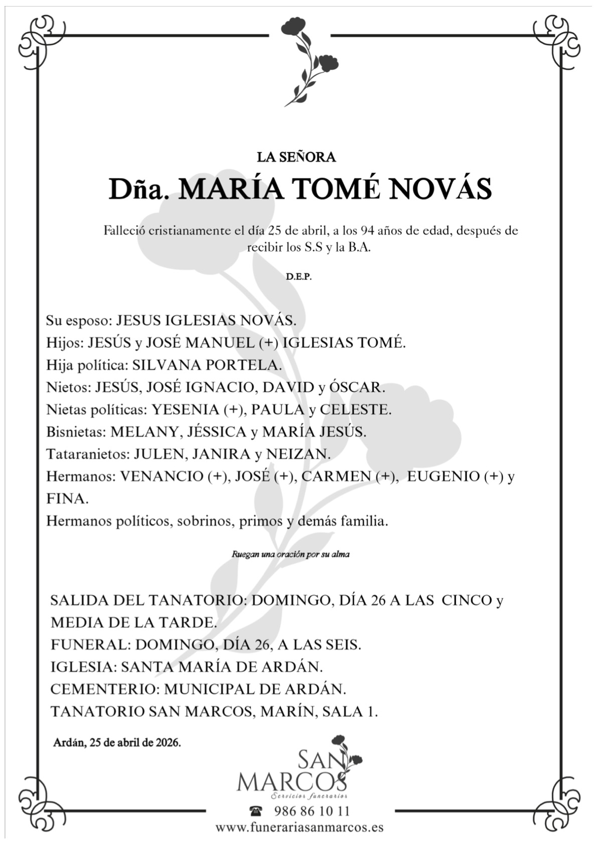 La funeraria SAN MARCOS comunica el fallecimiento HOY, día 25 de abril de doña MARÍA TOMÉ NOVAS cuyos restos mortales permanecerán en el Tanatorio San Marcos, de Marín, sala número 1, hasta el momento de su traslado mañana domingo día 26 a las cinco y media de la tarde al cementerio municipal de Ardán para su inhumación.