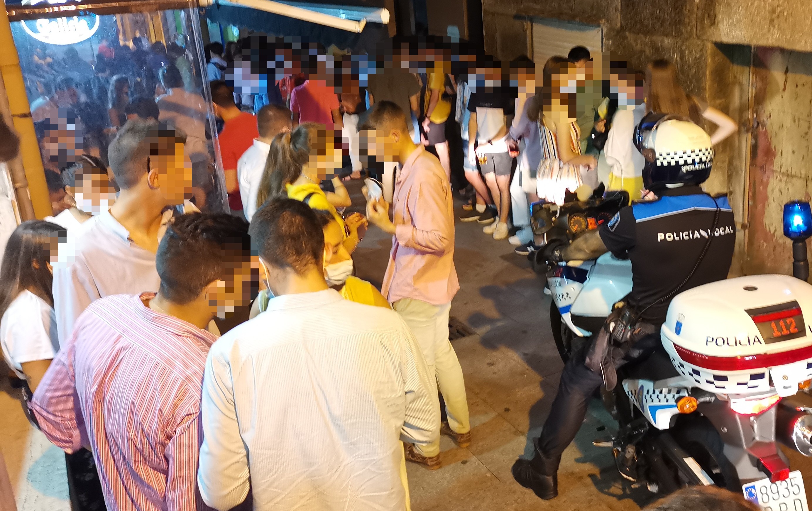 La Policía local se presentó también en la Rua da Roda después de recibir numerosas llamadas de vecinos denunciando que a la altura de uno de los establecimientos de esta calle no se podía pasar debido a la muchedumbre hacinada, de los cuales muchos ni guardaban las distancias ni tenían la mascarilla bien situada como las normas exigen.