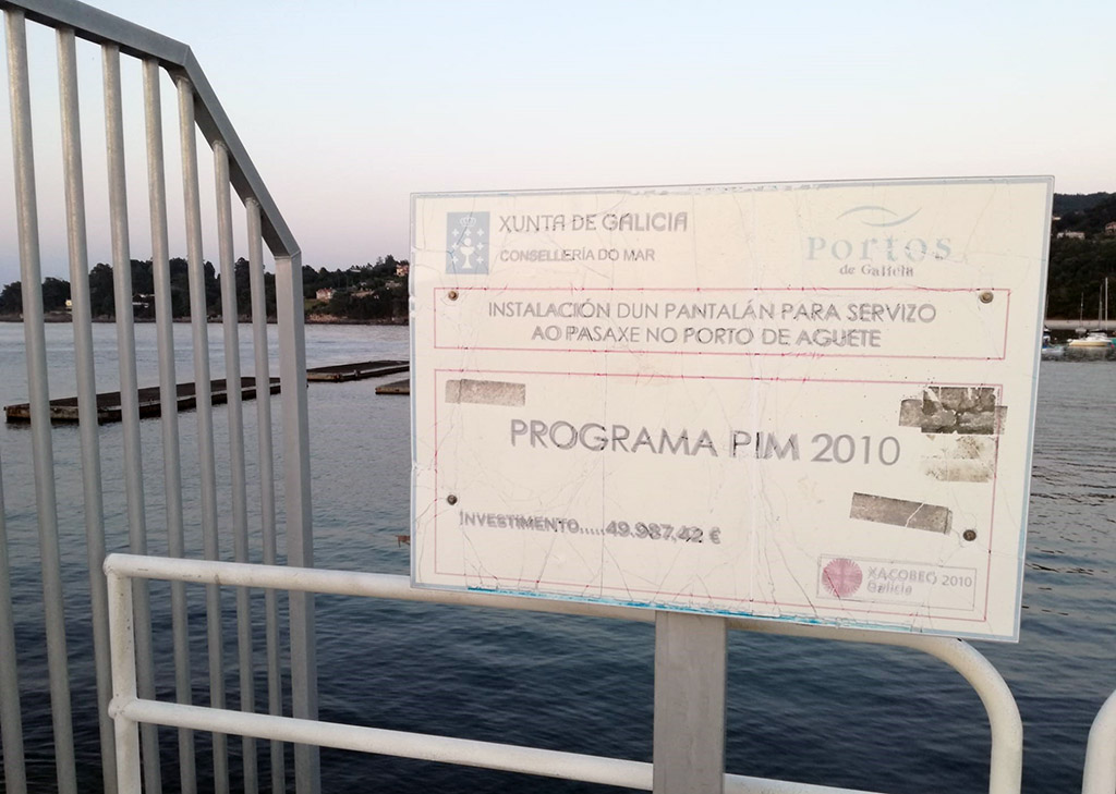 Entre estos parches recuerdo alguno que puso otro conselleiro o presidente de Portos o algo así, que llegó un día con un proyecto para hacer un embarcadero al que podrían atracar los barcos de pasaje que estaba seguro de que llegarían a Aguete con regularidad. Se gastó un pastón, nada menos que 49.987,42 euros, en aquello que denominó “Programa PIM 2010” una cantidad que, desde 2010 hasta hoy podría ser poco menos que lo que ahora van a emplear en el otro parche. Sucedió que colocaron el pantalán, nunca funcionó; retiraron el pantalán... y se esfumaron los cincuenta mil euros del ala que no quiero pensar mal pero... Y la desfachatez llega a tal punto que a nadie, veintitantos años después, se le ocurrió todavía arrancar de la puerta del fallido embarcadero el ignominioso cartel que anuncia el gasto más inútil que se haya hecho nunca en un puerto de la ría, gasto de puro parche y, seguramente, poroso.