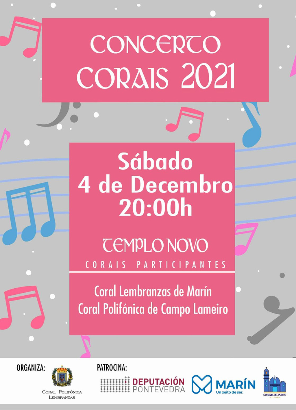Siendo Marín como es un pueblo tremendamente aficionado al canto, ya se echaban de menos los conciertos de las corales que con frecuencia organizan actuaciones invitando a grupos de otros municipios. La pandemia tuvo la culpa de la interrupción y antes de que las cosas vuelvan a ponerse feas, el sábado tendremos concierto en el Nuevo Templo