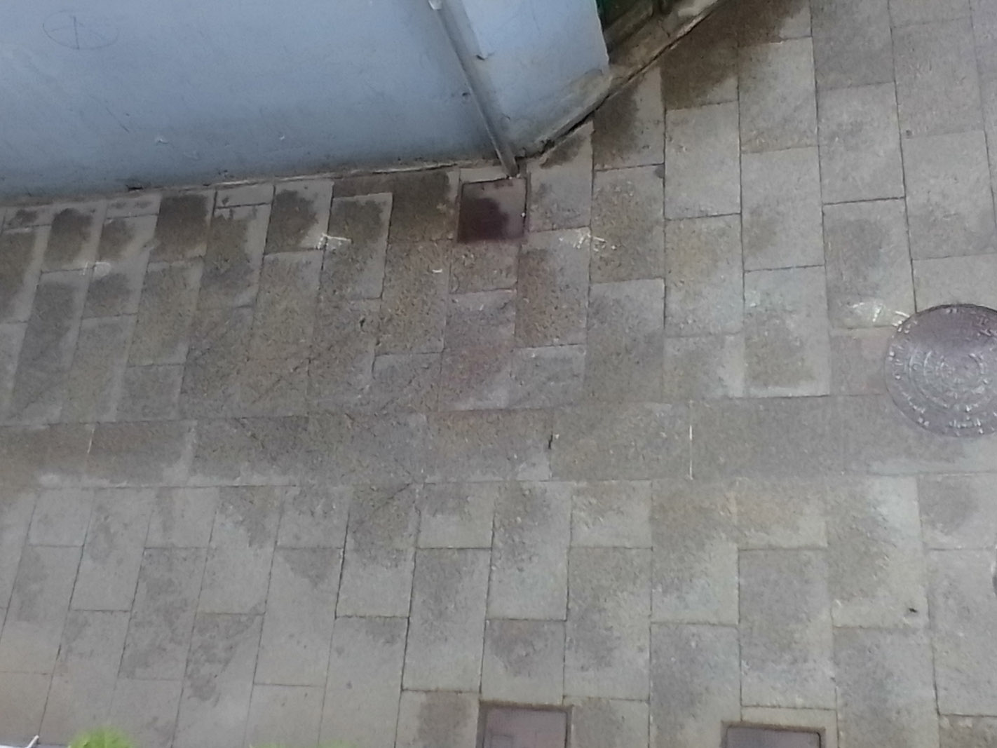 En primer lugar, agradecer que se haya "baldeado" la calle, como había solicitado, lo pongo entre "comillas", pues es lo que se ha realizado literalmente. Ahora bien, la pintura sigue, no es difícil de quitar, puesto que es al agua, eso sí, cuanto más tarde se haga, al ser piedra con rugosidades, más complicado será eliminarla. Cómo podrán comprobar, la parte correspondiente a mí fachada, con cuatro cubos de agua y una simple escoba de cerdas duras, se hace perfectamente.