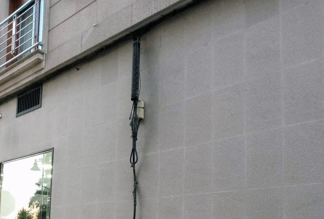Perdonen vds. pero a continuación publico foto de una de las maravillas que hemos referido y breve comentario jocoso como si se tratase de un pase de modelos fachendoso....... La pared en cuestión, luce una especie de preservativo de elefante mecido por el viento del Este, caja de tamaño medio atada de cualquier manera y resto de colgajo hasta introducirse en un tubo metálico y directo al suelo. A menos de cuatro metros más de lo mismo con otro estilo y así por toda la Rúa Real y Do Sol......