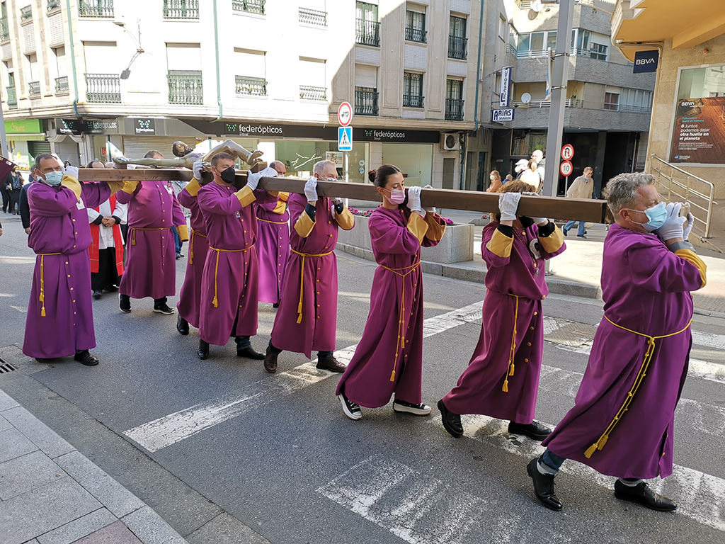 Un nutrido grupo de fieles acompañó a la Santa Cruz durante las procesión que se inició a las once de la mañana y que, tras recorrer varias calles céntricas del casco urbano, se recogió en el Nuevo Templo. La enorme Cruz era portada por miembros de la Cofradía del Sepulcro y por la banda de cornetas y tambores que tan excelente participación han tenido durante los actos procesionales de la Semana Santa dejando impronta de su actual calidad musical y a pesar de los dos años en que vieron interrumpida su labor a causa de la pandemia.