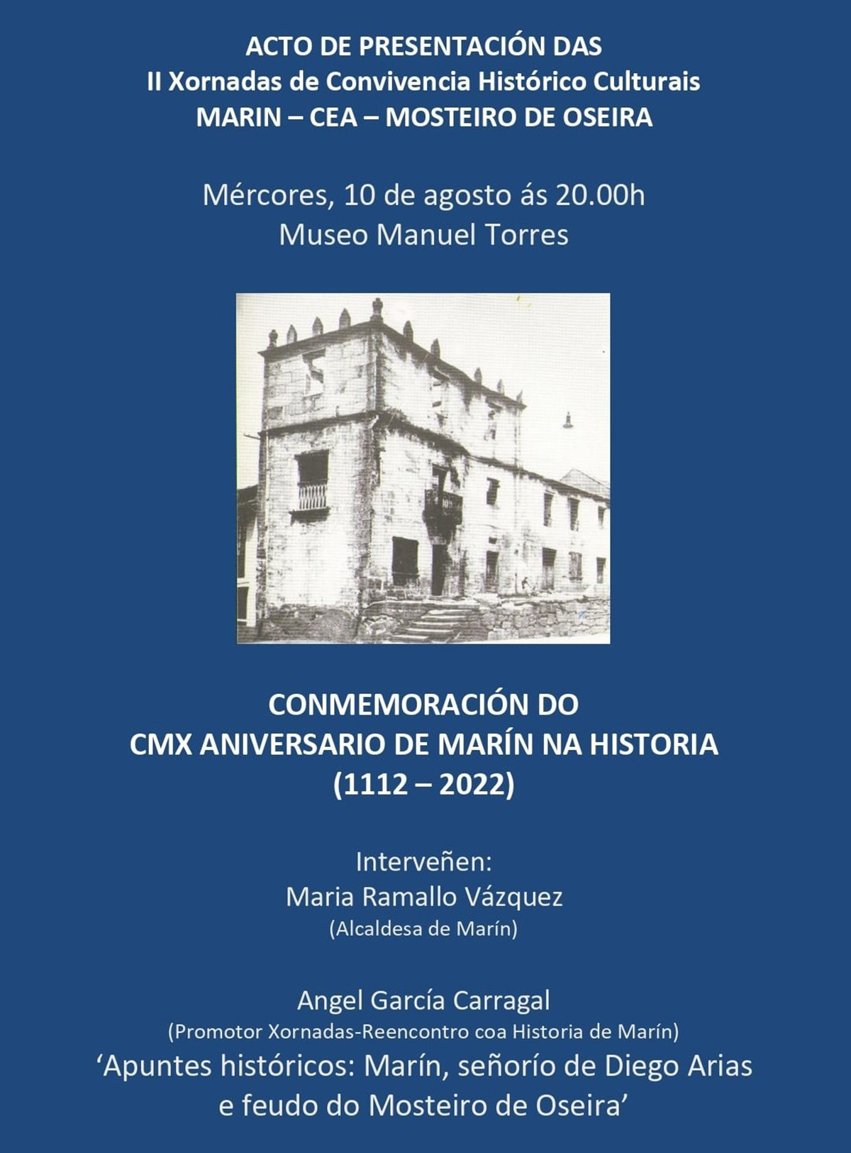 El próximo mièrcoles día 10 a las ocho de la tarde tendrá lugar en el Museo Torres un acto de presentación e las “II Xornadas de Convivencia Histórico-Culturales Marín-Cea-Mosteiro de Oseira” en el que se iniciará la celebración del ciento diez aniversario de lo que se podría considerar el nacimiento de Marín.