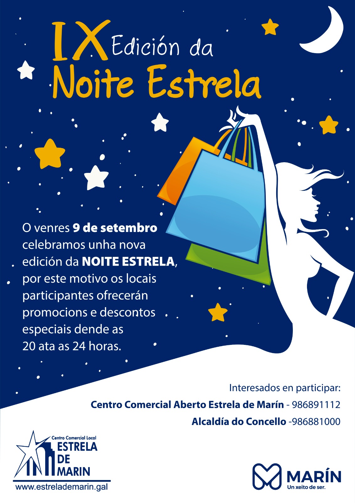Se recupera la “Noite Estrela”, interrumpida por la pandemia hace dos años y que promueve la asociación “Estrela de Marín” con el decidido apoyo del ayuntamiento, según indican desde el colectivo comercial marinense desde donde se informa: “Trátase dunha acción de dinamizacion comercial que consiste en manter abertos os establecementos dende as 20:00 ata as 00:00 horas, o próximo 9 de setembro, ofrecendo aos clientes descontos e promocións, tanto nos produtos de rebaixas como nos de nova tempada ou en produtos seleccionados. Esta campaña será a 9ª edición, levándose a cabo durante varios anos e que quedou suspendida durante a pandemia”.