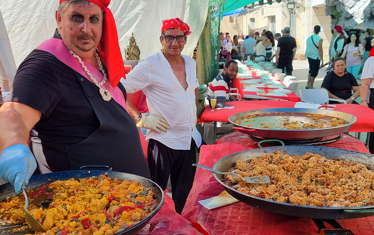 Además de los numerosísimos “comedores” al aire libre rodeados de los humos de las parrillas donde se asan churrascos y “de todo” para disfrute de las cuadrillas de piratas bien ataviados con la vestimenta adecuada en la mayoría de los casos, se suceden los espectáculos callejeros como la llegada del “Bella Helenes”, galeón inglés al que Don Jerónimo Biquet con su “Sagrada Familia” que era un barco pesquero con marineros voluntarios a bordo, le dio para el pelo en la realidad histórica.