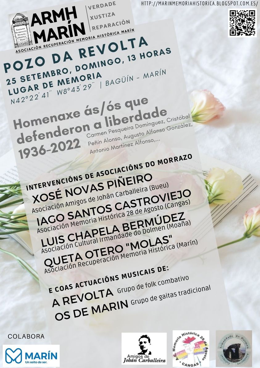 Contaremos coa presenza de asociacións memoralísticas da comarca de O Morrazo, como son a Asociación Amigos de Johán Carballeira de Bueu, a Asociación Memoria Histórica 28 de Agosto de Cangas e a Asociación Cultural Irmandade do Dolmen de Moaña; e sendo anfitriona do acto a Asociación pola Recuperación da Memoria Histórica de Marín.